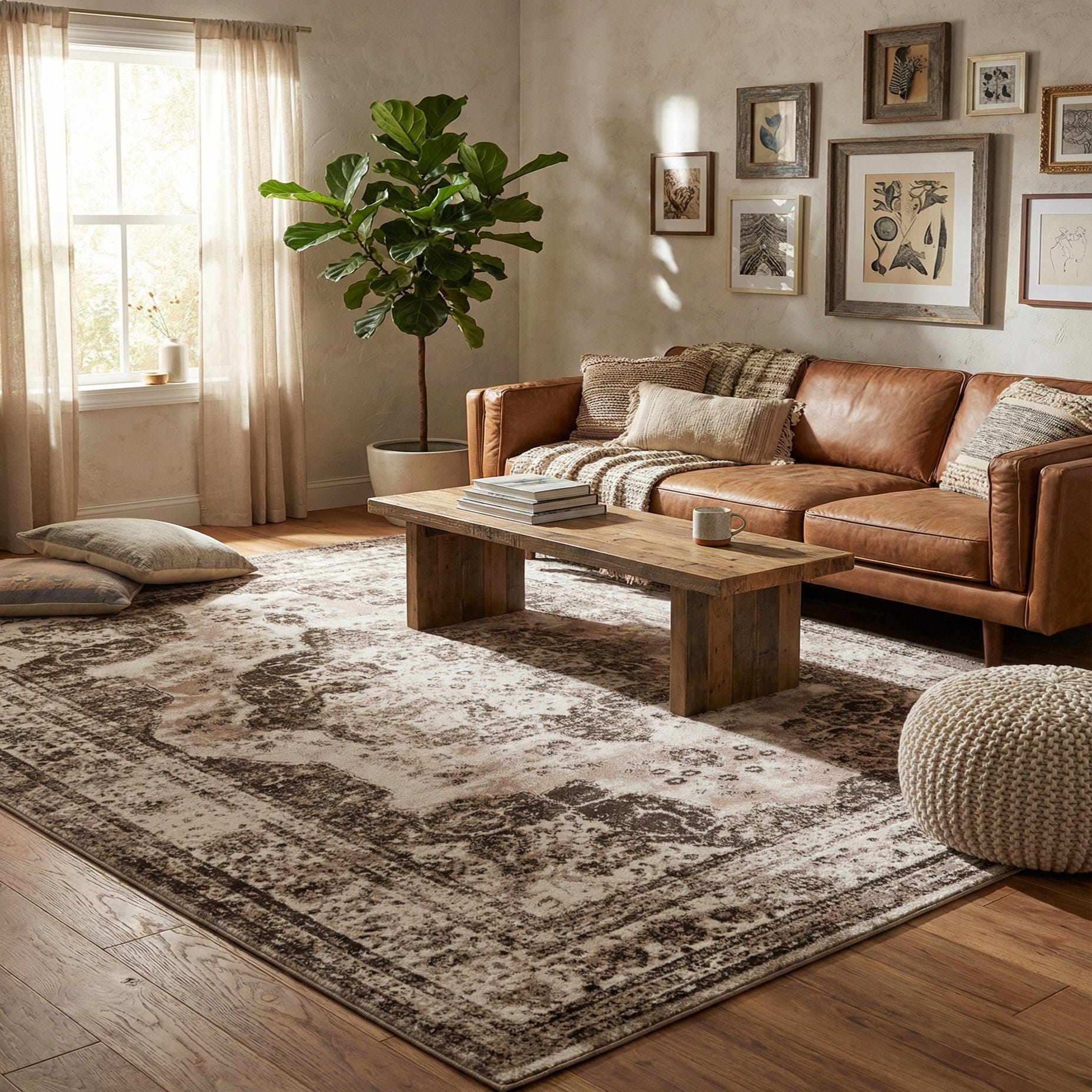 Ideal for anchoring living rooms, dining areas, or spacious bedrooms, this rug can fit seamlessly into varied design scenarios, including minimalist, rustic, and even industrial spaces that benefit from a touch of softness and a hint of traditional charm.