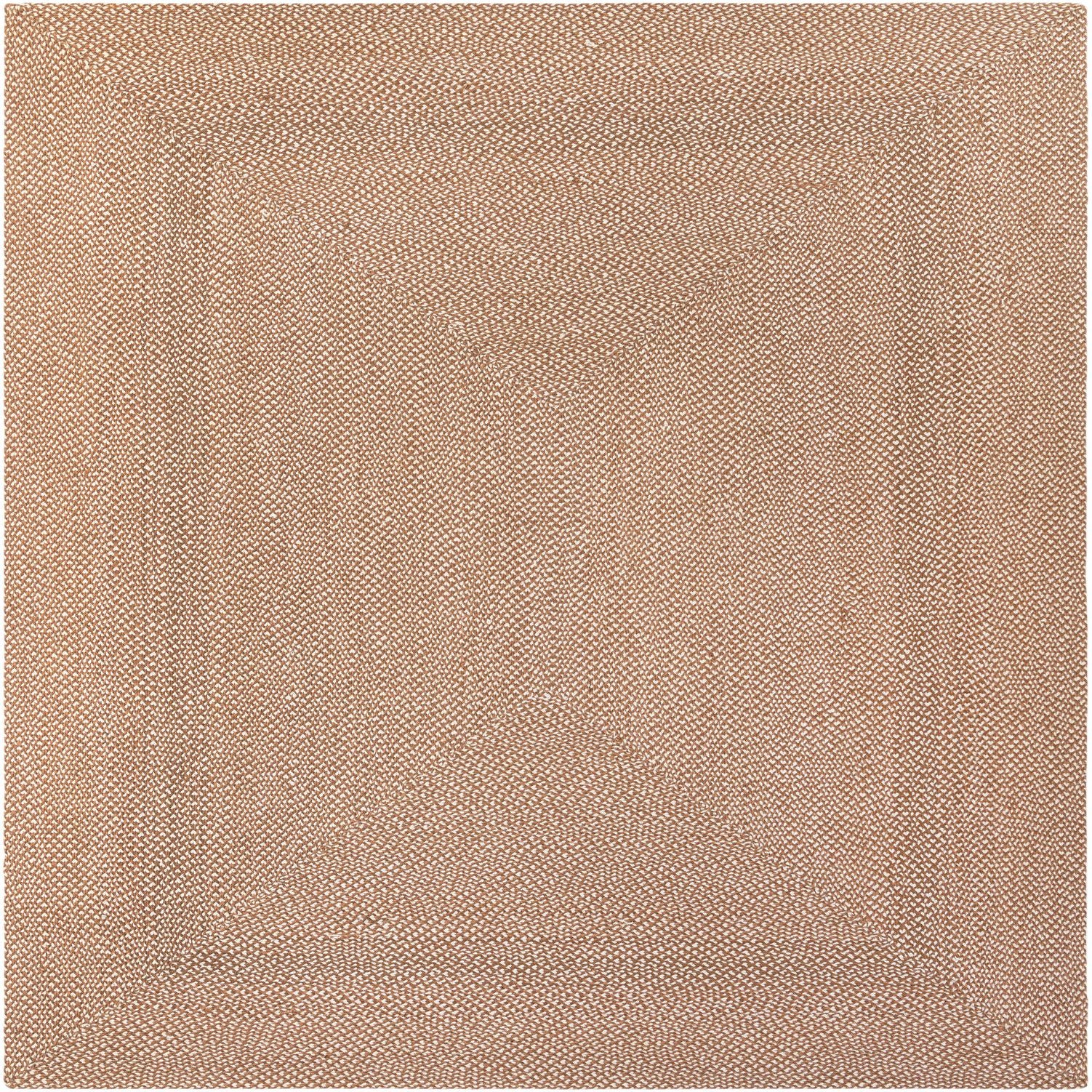 Hand-braided of 100% jute, this rug presents a tight, concentric braided pattern that forms a subtle rectangular frame across the surface. The background is light brown with ivory flecks woven throughout, creating a soft tweed-like visual texture. The braided construction gives a low-profile, tactile feel underfoot with gentle ridging that adds depth without heaviness.