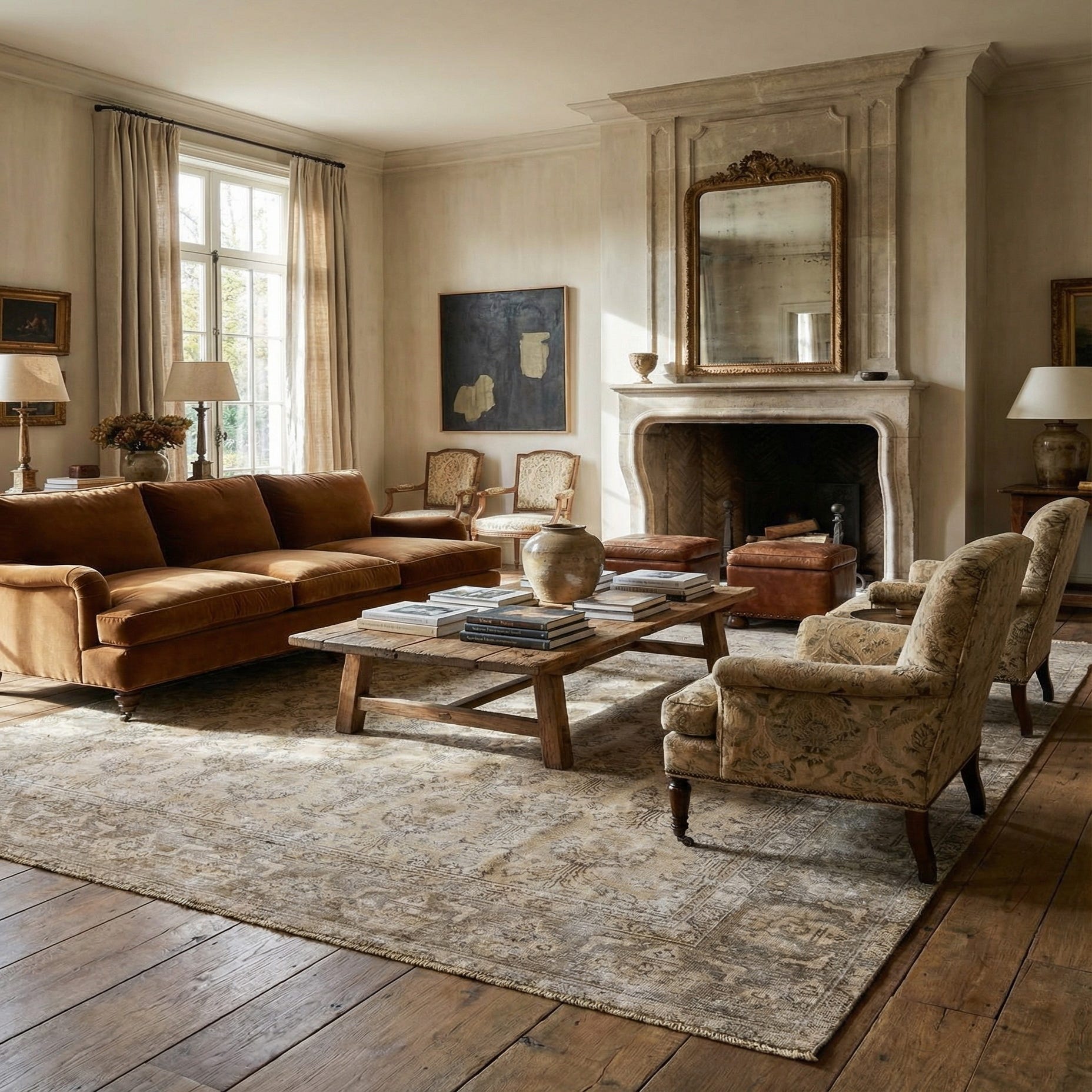 This rug fits well in a range of interiors: place it beneath a seating group to anchor a neutral living room, layer it under a wood dining table to add texture without competing with tableware, or use it to introduce warmth in a home office or bedroom. It complements warm wood tones, cream or linen upholstery, and matte black metal accents, and integrates easily with both traditional and transitional schemes that favor layered, tactile materials.