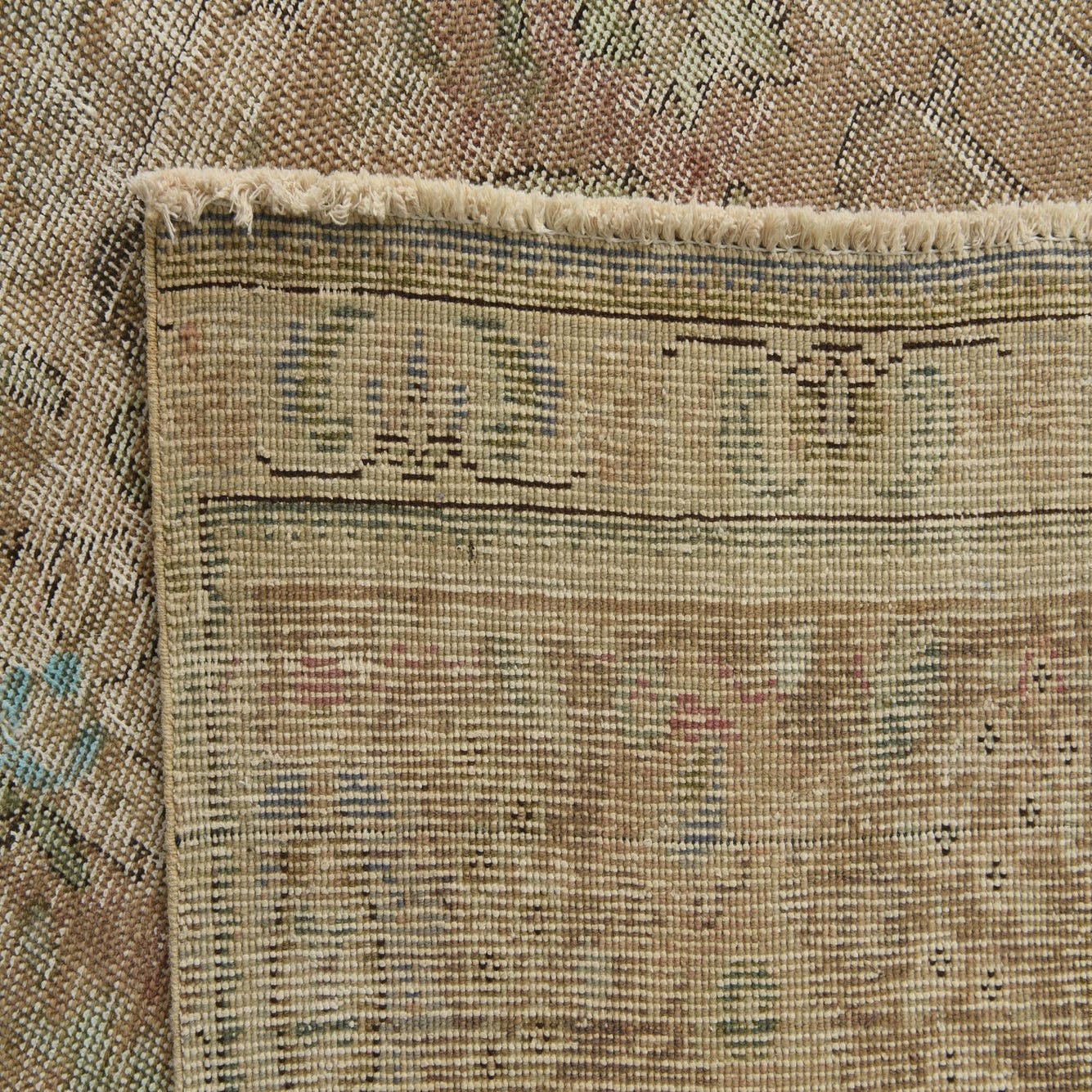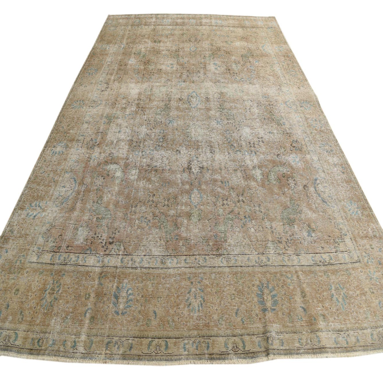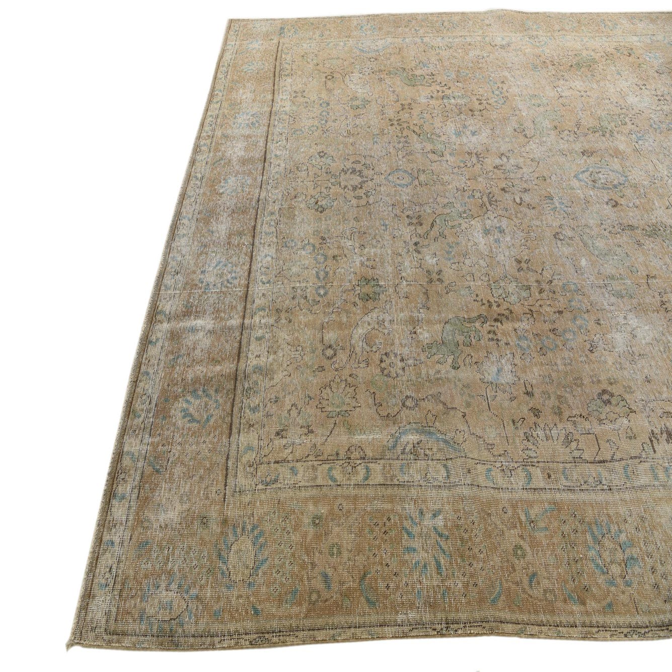 The Ultra Vintage Hand Knotted Wool Rug brings an aura of sophistication and timeless design to any space. Sized at a generous 9x12, this rug showcases a light brown background elegantly punctuated by a harmonious blend of brown, green, and blue accents. The pattern features traditional motifs that display a beautifully distressed look, speaking to the rug's vintage inspiration and charm.