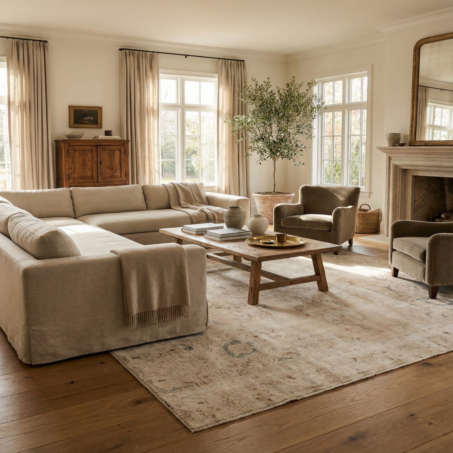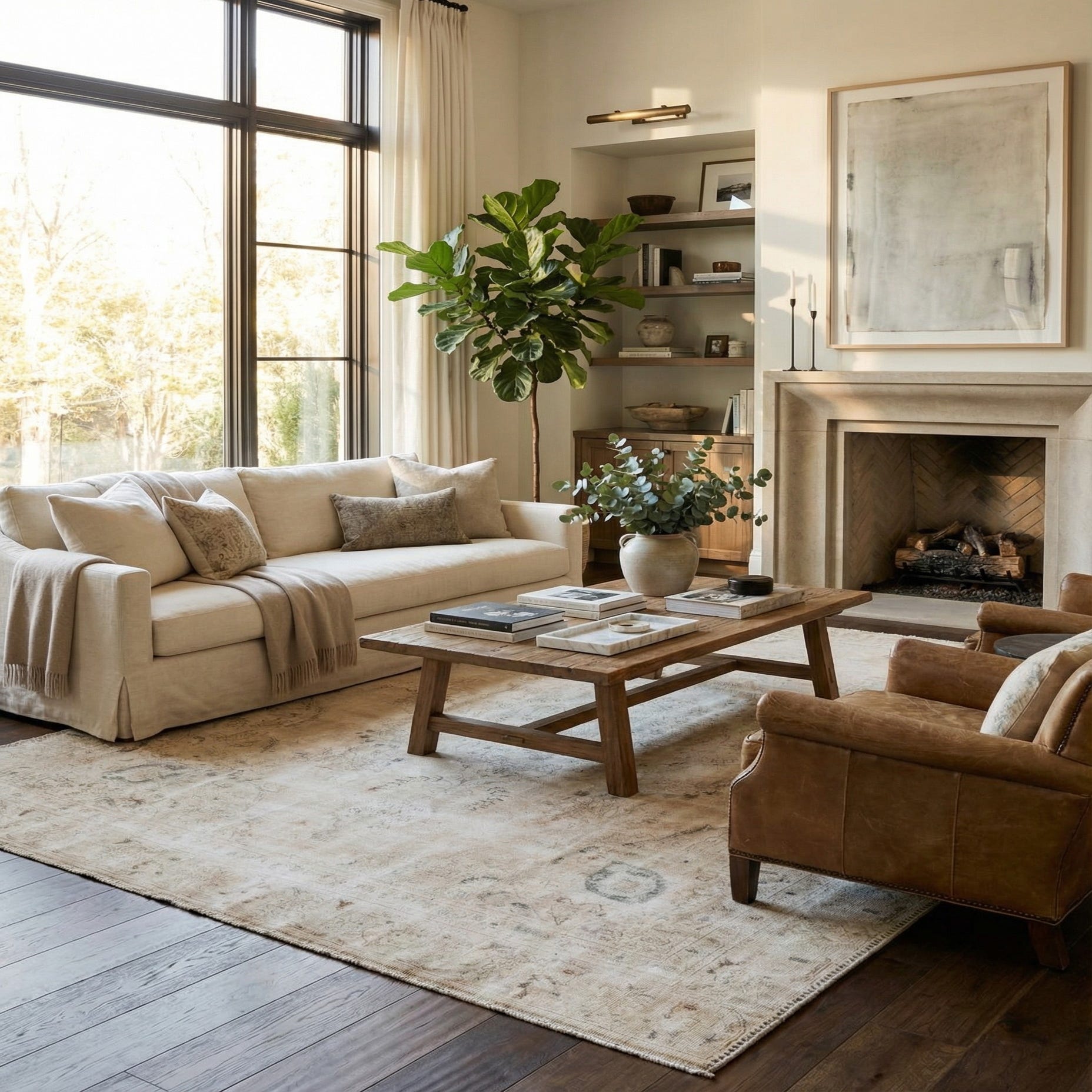 This versatile piece complements a range of interior design styles, from classic to contemporary. It pairs well with natural wood elements, leather furnishings, and rich textiles, making it ideal for a living room, dining area, or a grand entryway. Its neutral yet varied palette allows for seamless integration into existing color schemes while providing a foundation that anchors the decor of the room.