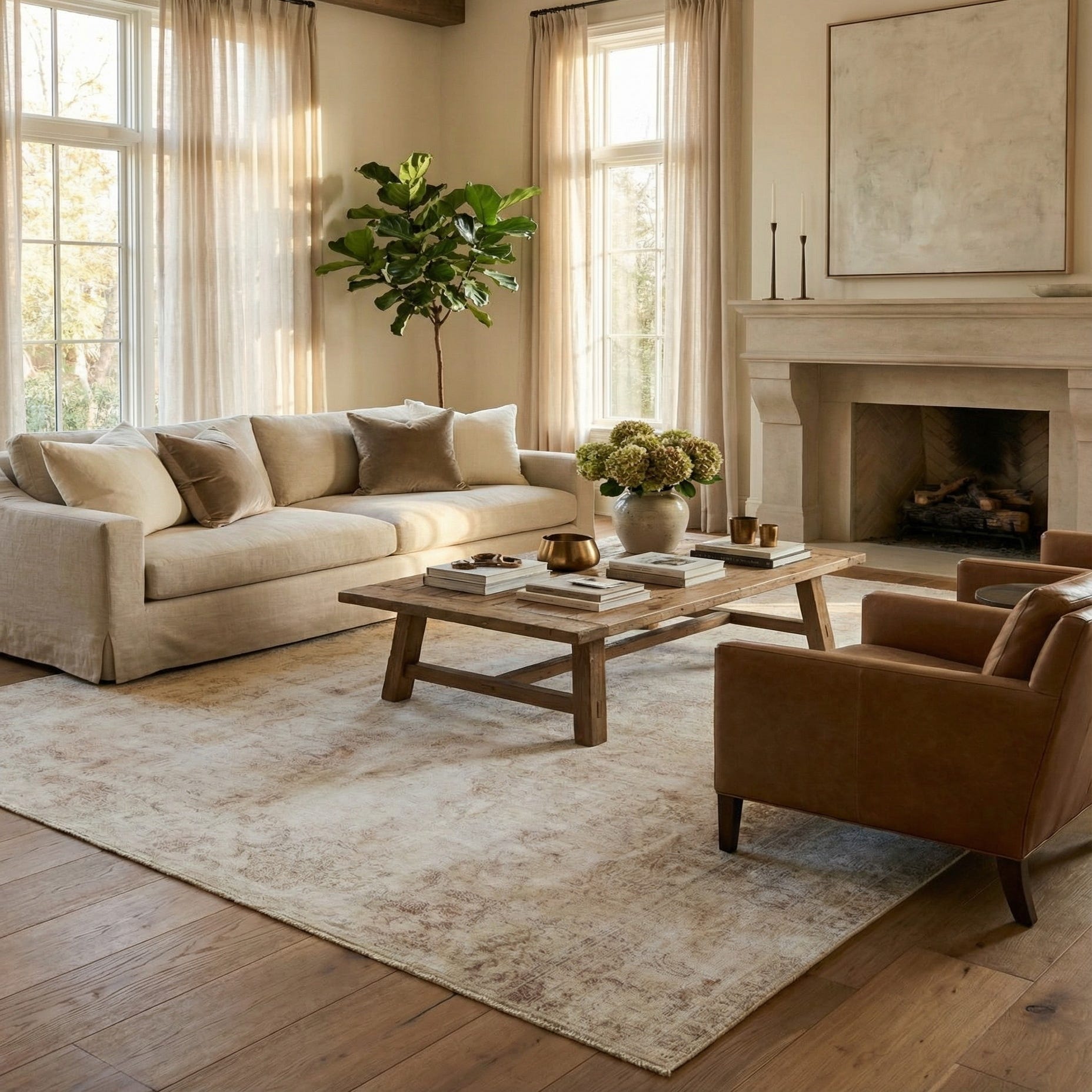 A 9x12 rectangular Ultra Vintage wool rug in browns and tans with a distressed Persian medallion pattern.