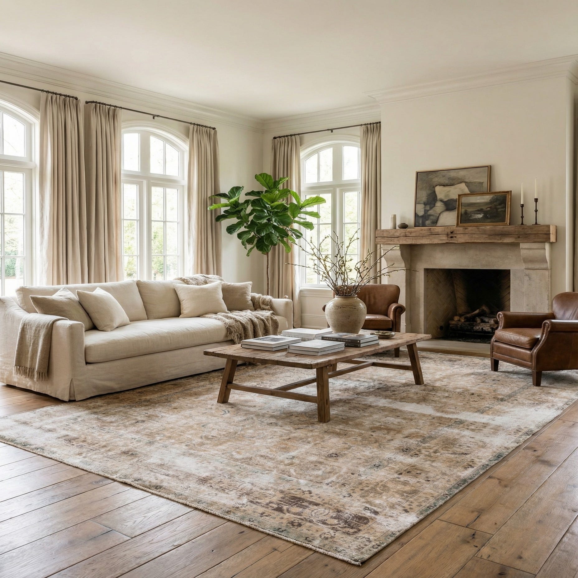 The rug's texture and warm palette make it highly versatile, easily integrating with various decor styles, including traditional, transitional, and even contemporary settings due to its vintage charm. The sophisticated but subtle pattern allows it to serve as a grounding element in a room rich with textures and colors, or as a focal point in a more muted space.