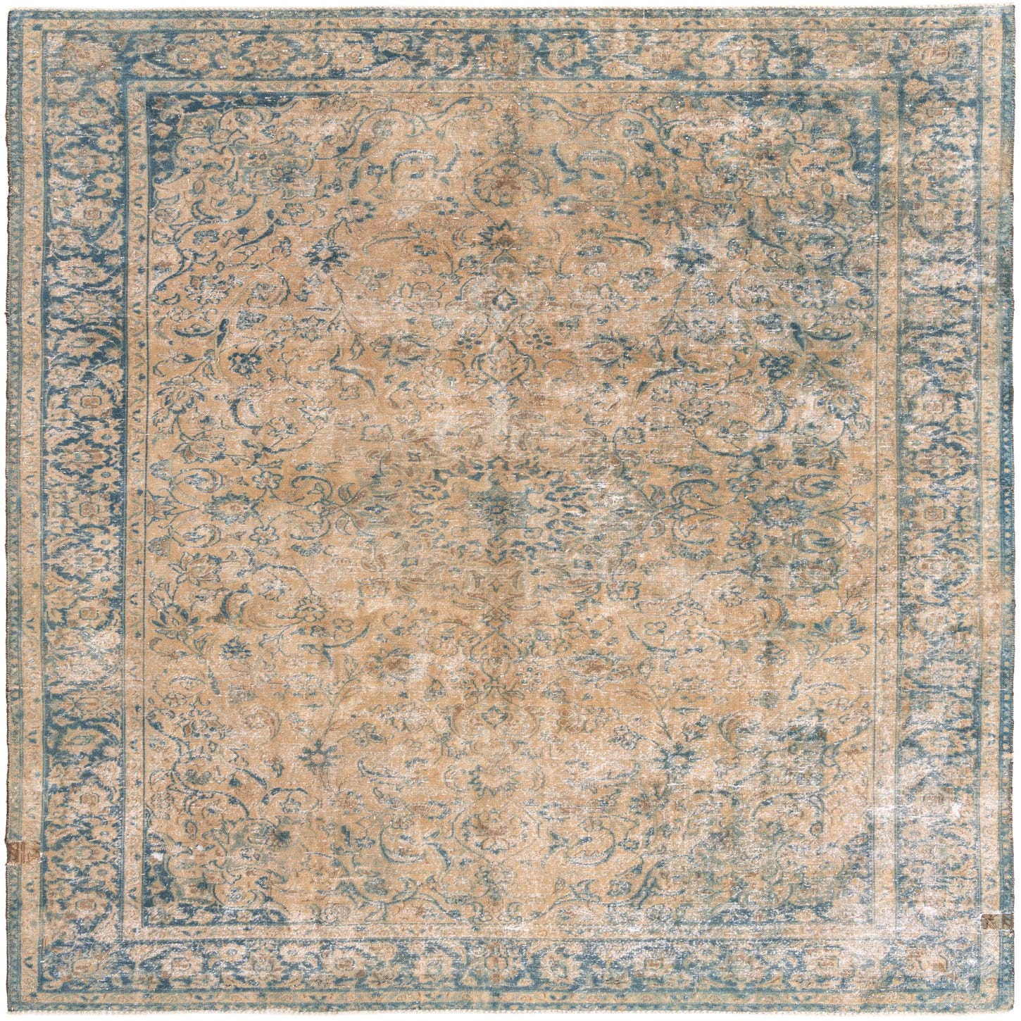 A 9x12 rectangular Ultra Vintage rug in tan and faded blue, featuring a distressed Persian medallion and floral border pattern.