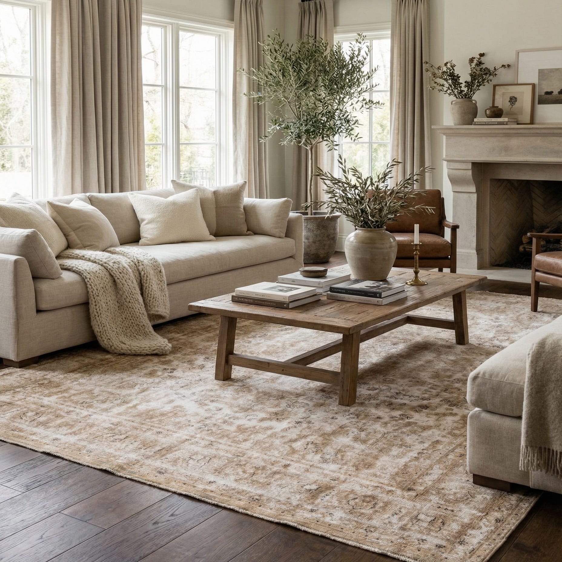 A 9x12 rectangular Ultra Vintage wool rug in shades of brown and tan, featuring a distressed Persian medallion pattern.