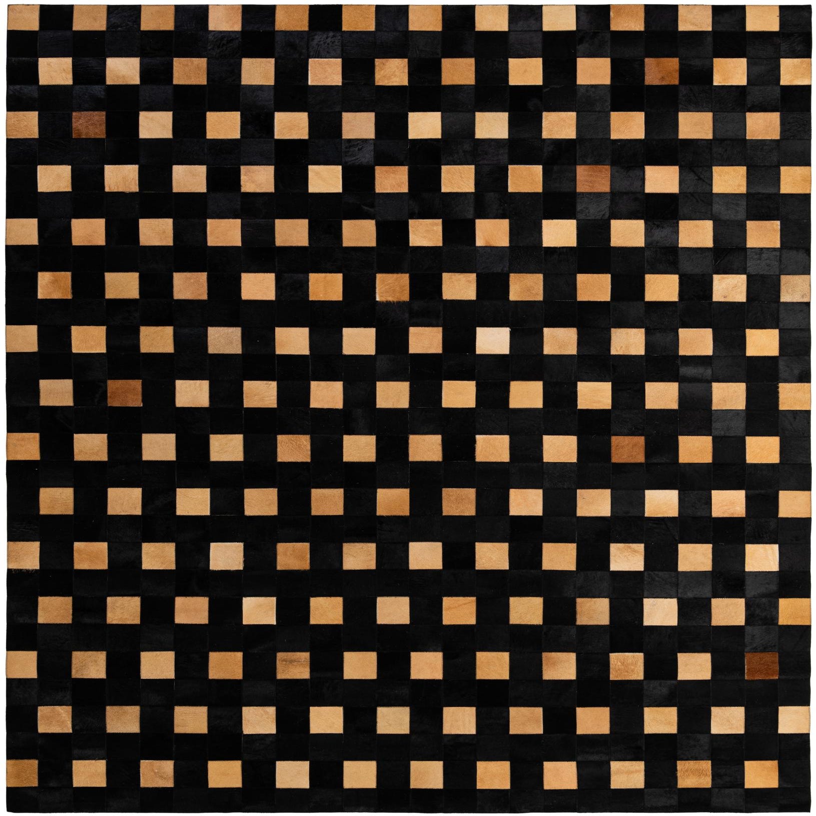 A rectangular 8x10 light brown and black modern cowhide rug with a checkerboard patchwork pattern.