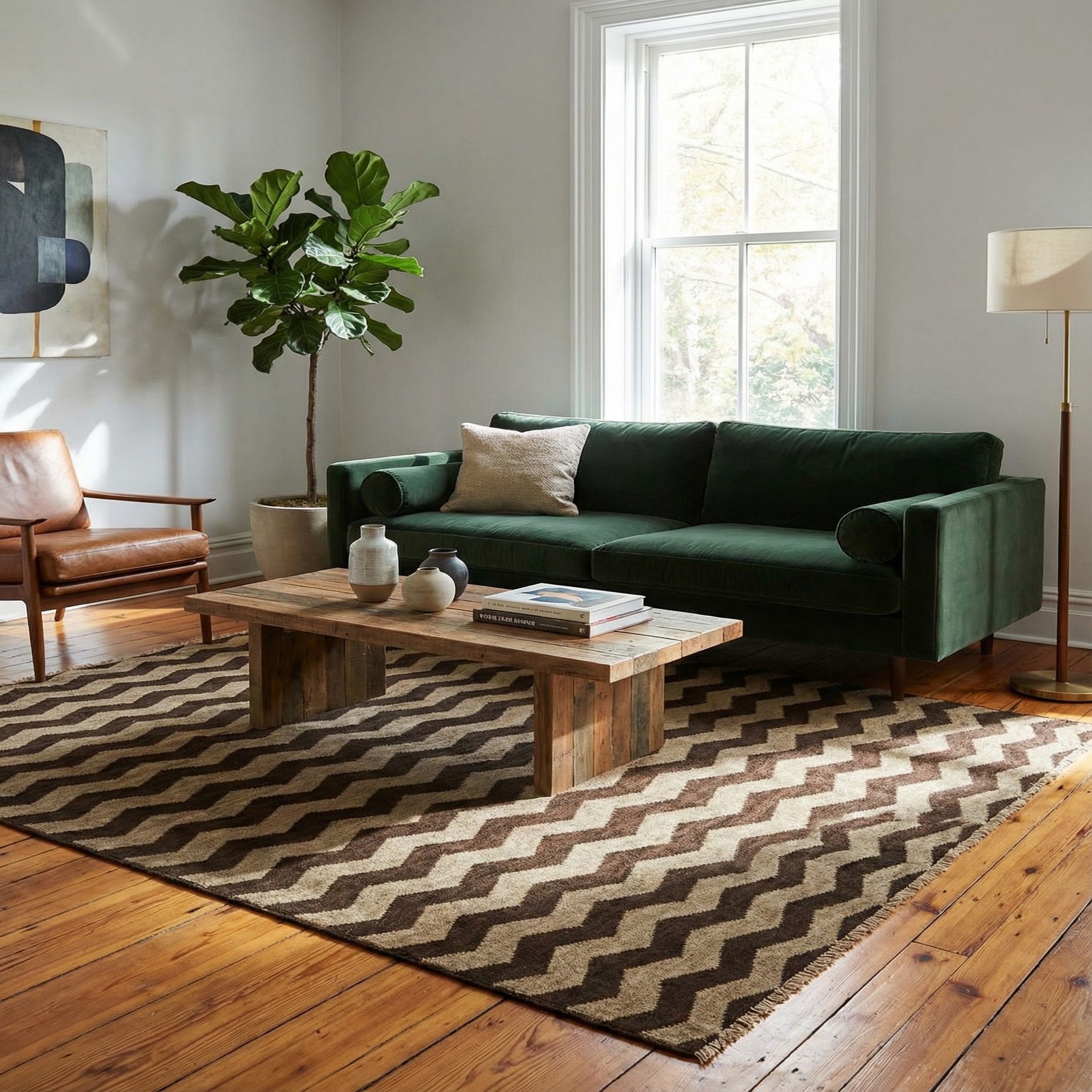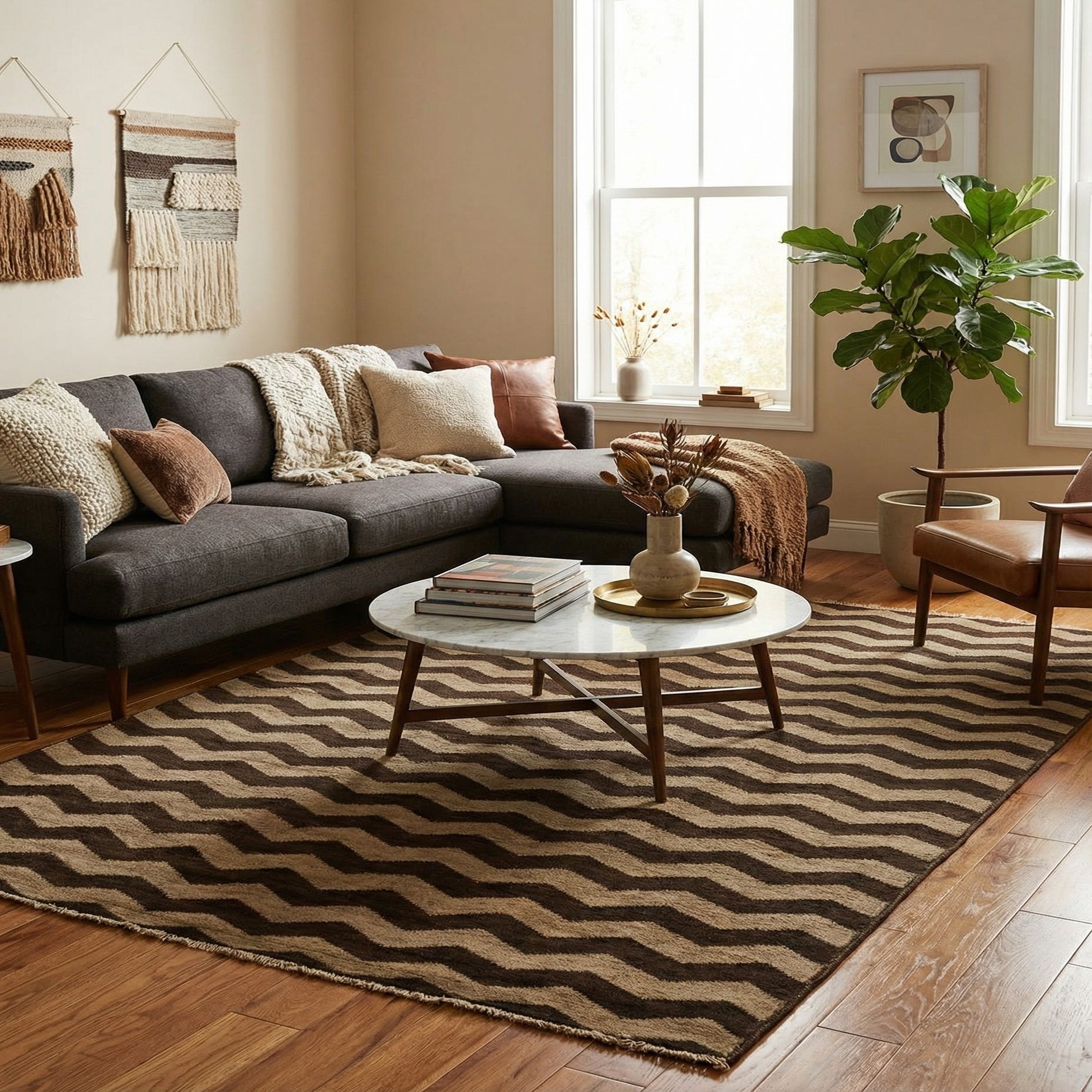 This rug works well as a grounding piece in living rooms and home offices where warm neutrals and clean lines are key. Pair it with mid-century or contemporary furnishings—walnut wood, leather seating, and matte metal accents complement the brown palette—or layer it in a cozy reading nook beneath a low coffee table to add structure without overwhelming the room. It also functions nicely in transitional spaces like entryways or dining areas, where the geometric rhythm helps define the area while coordinating easily with both rustic and modern decor.