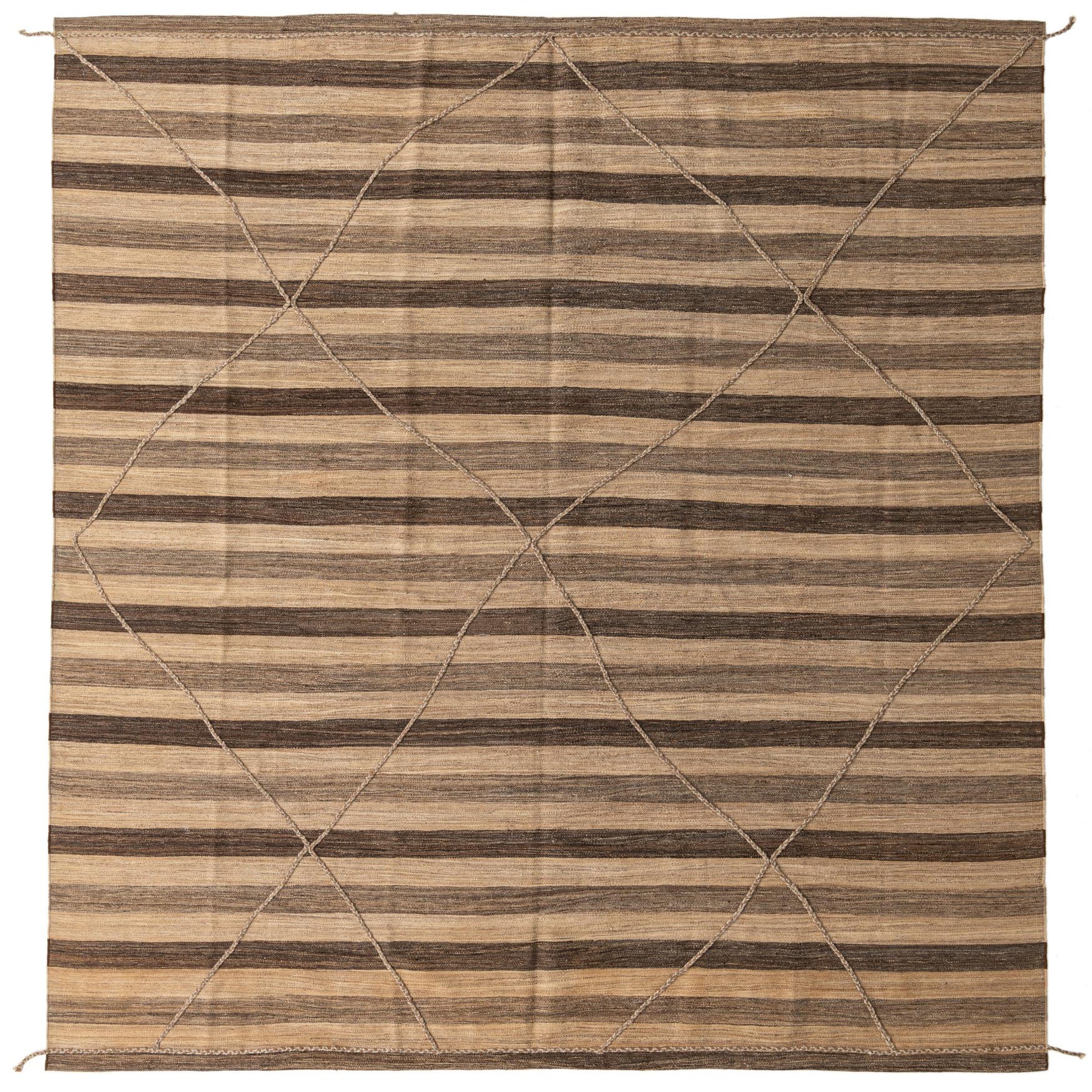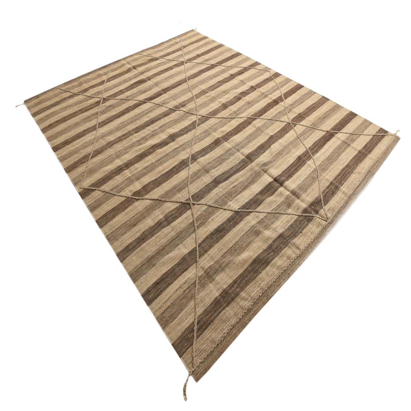 A 9x12 rectangular Moroccan shag rug with light brown and brown stripes and a diamond pattern.