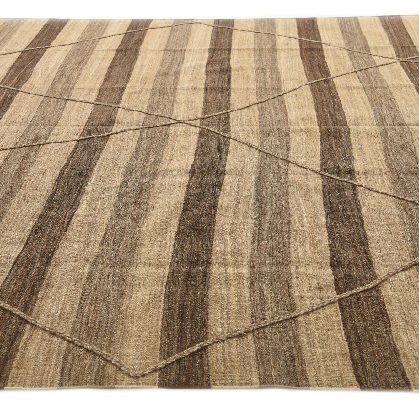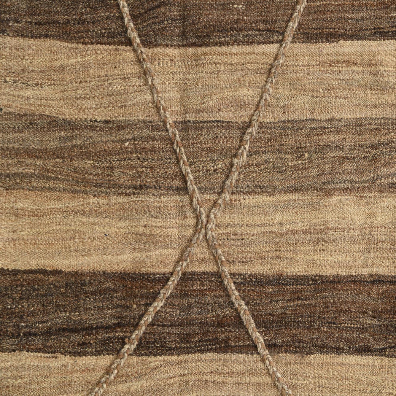 The rug features a bold geometric pattern of diamond shapes overlaid onto a field of horizontal stripes. This creates a visually compelling contrast that is both structured and dynamic. The color palette is grounded in shades of light brown and brown, offering an earthy and natural aesthetic that can integrate seamlessly into various decor styles.
