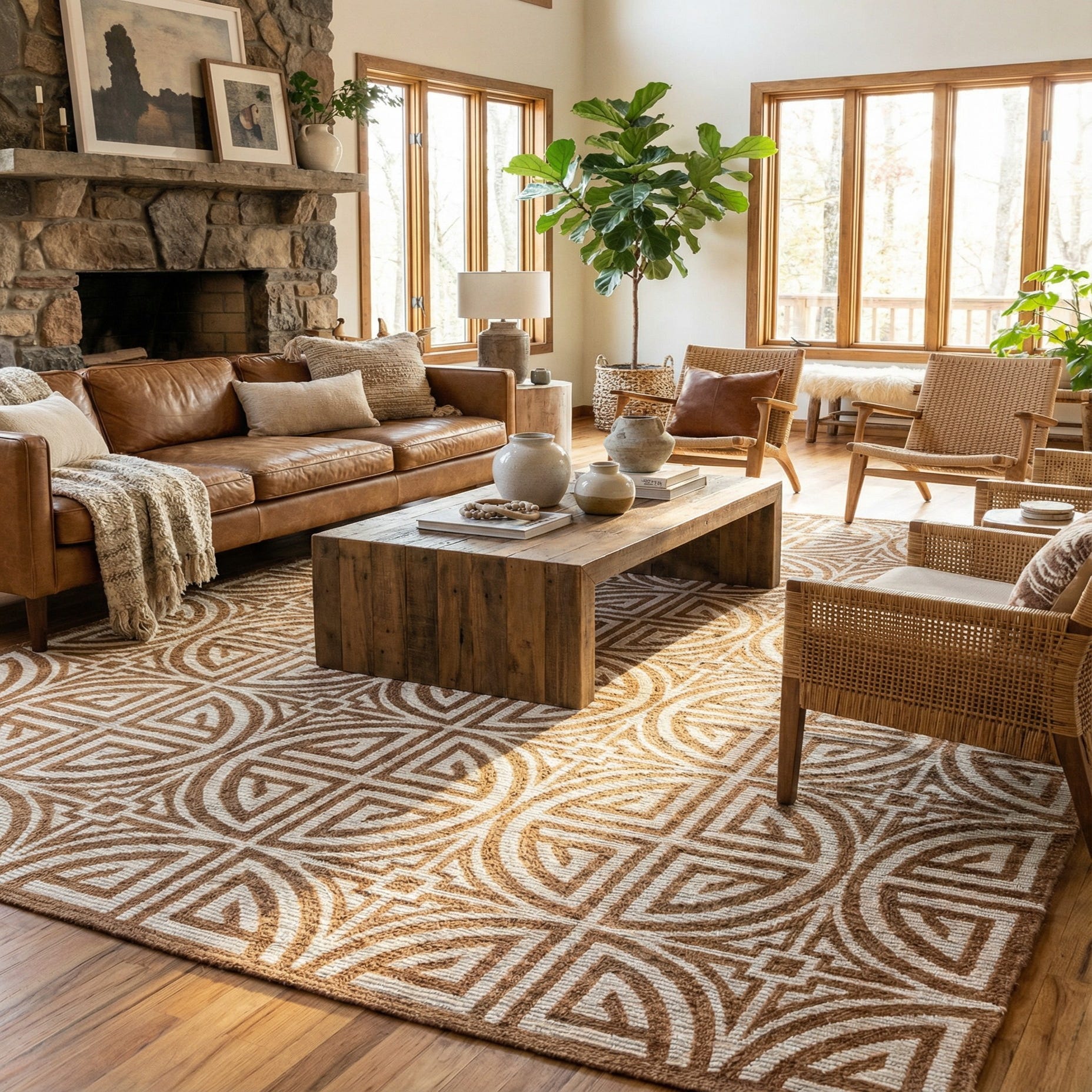 A bold geometric medallion pattern forms a precise grid across the surface, each circle built from concentric quarter?circle segments that meet at small square anchors. The design is rendered in warm light brown chenille set against an ivory jute ground, giving a clear, graphic contrast that reads both modern and grounded. The repeating motif and sharp lines create visual rhythm without overwhelming a room.