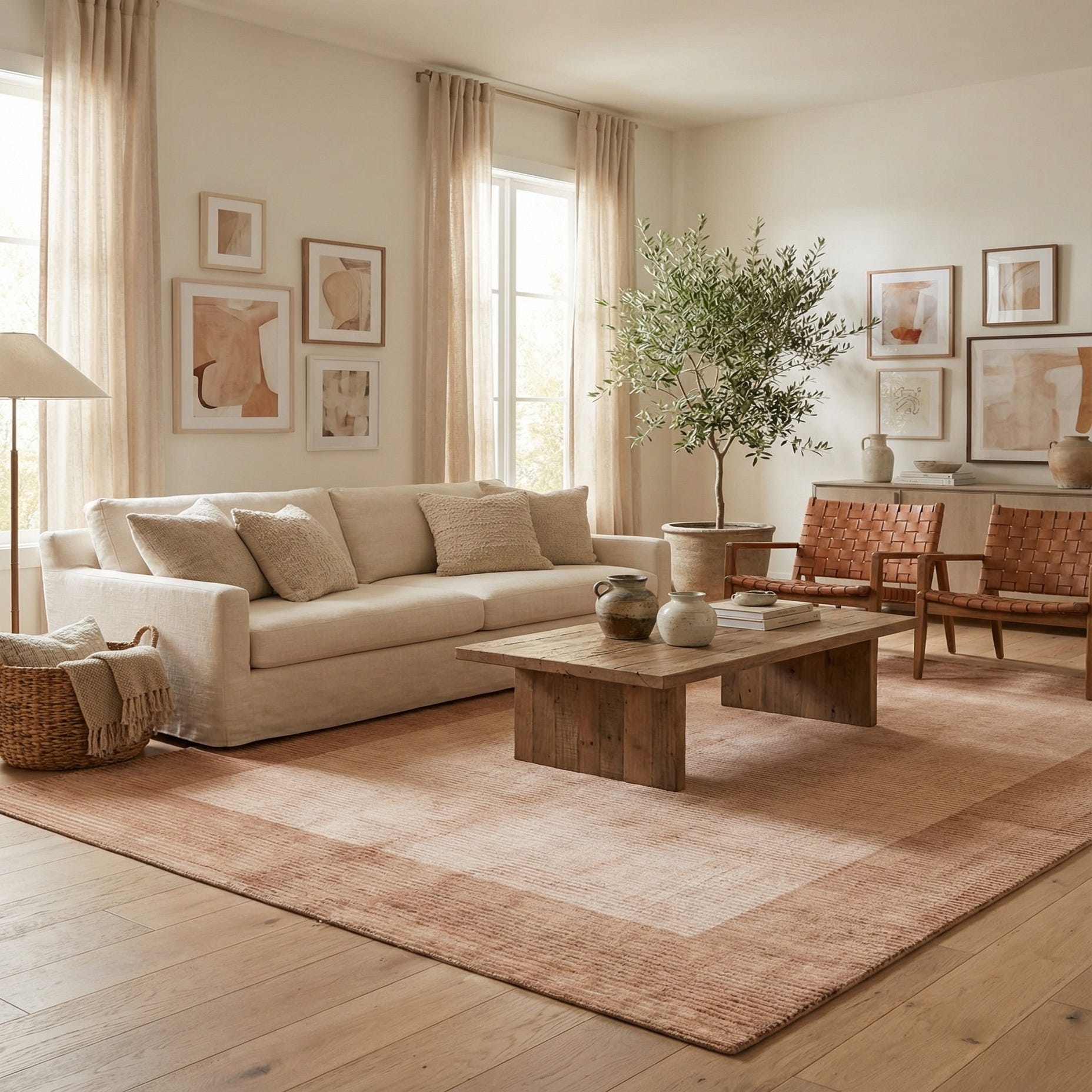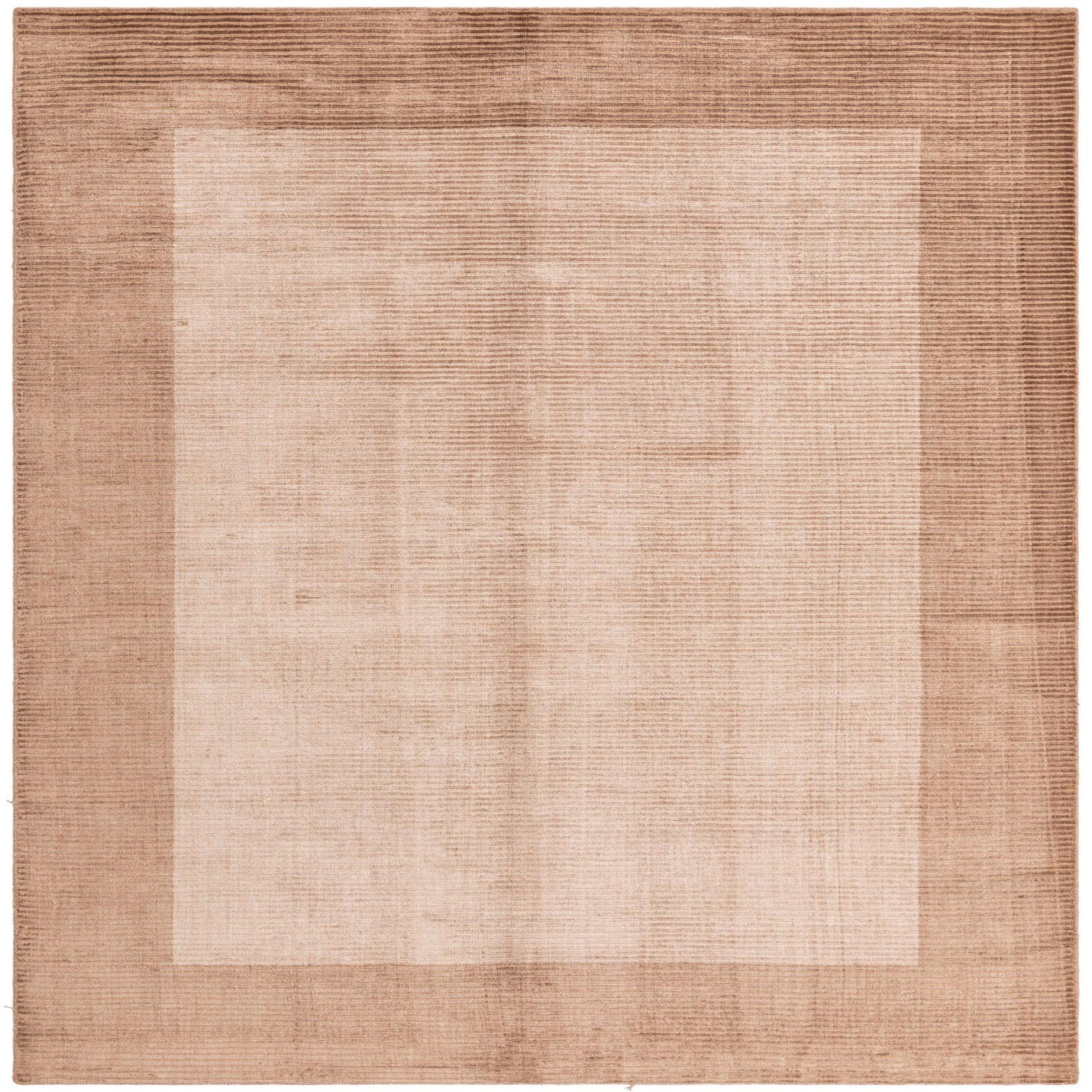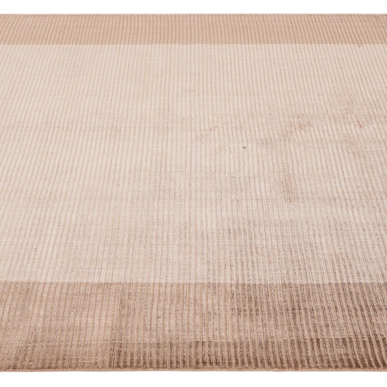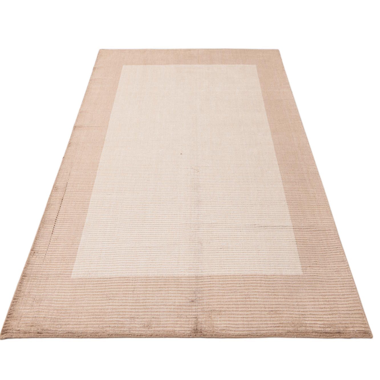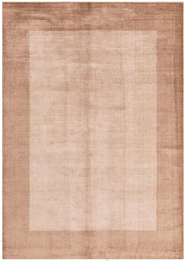 A 5x8 rectangular light brown and brown modern wool rug with a subtle border design, perfect for a living room.