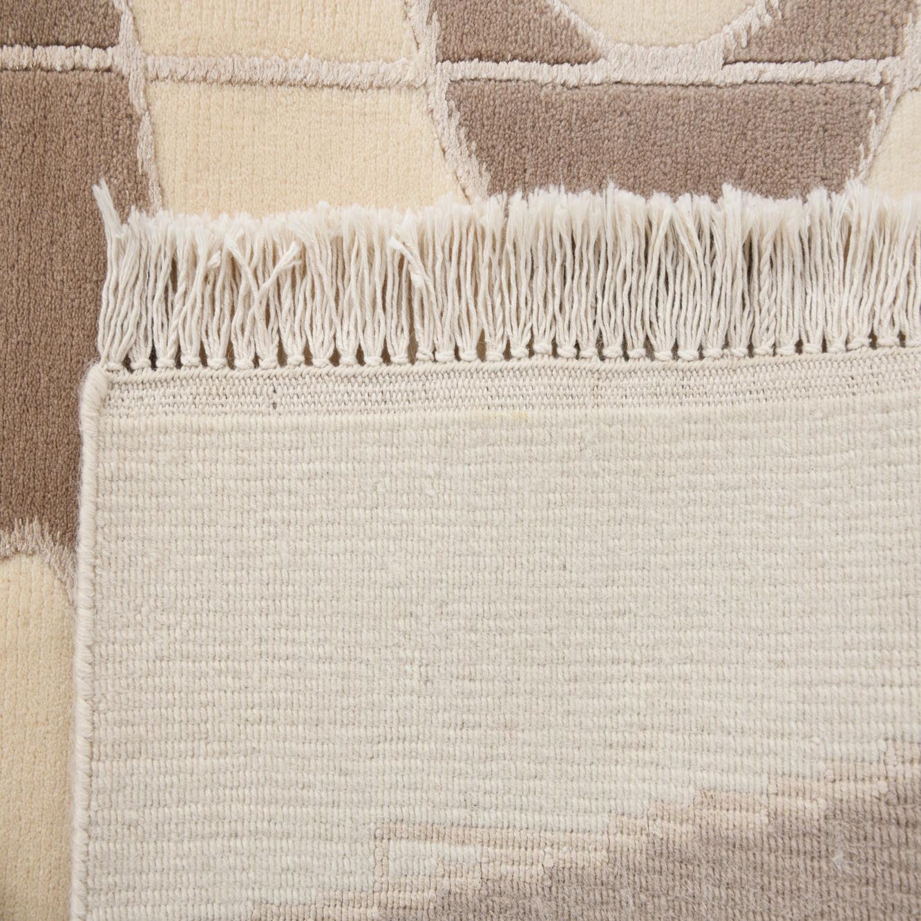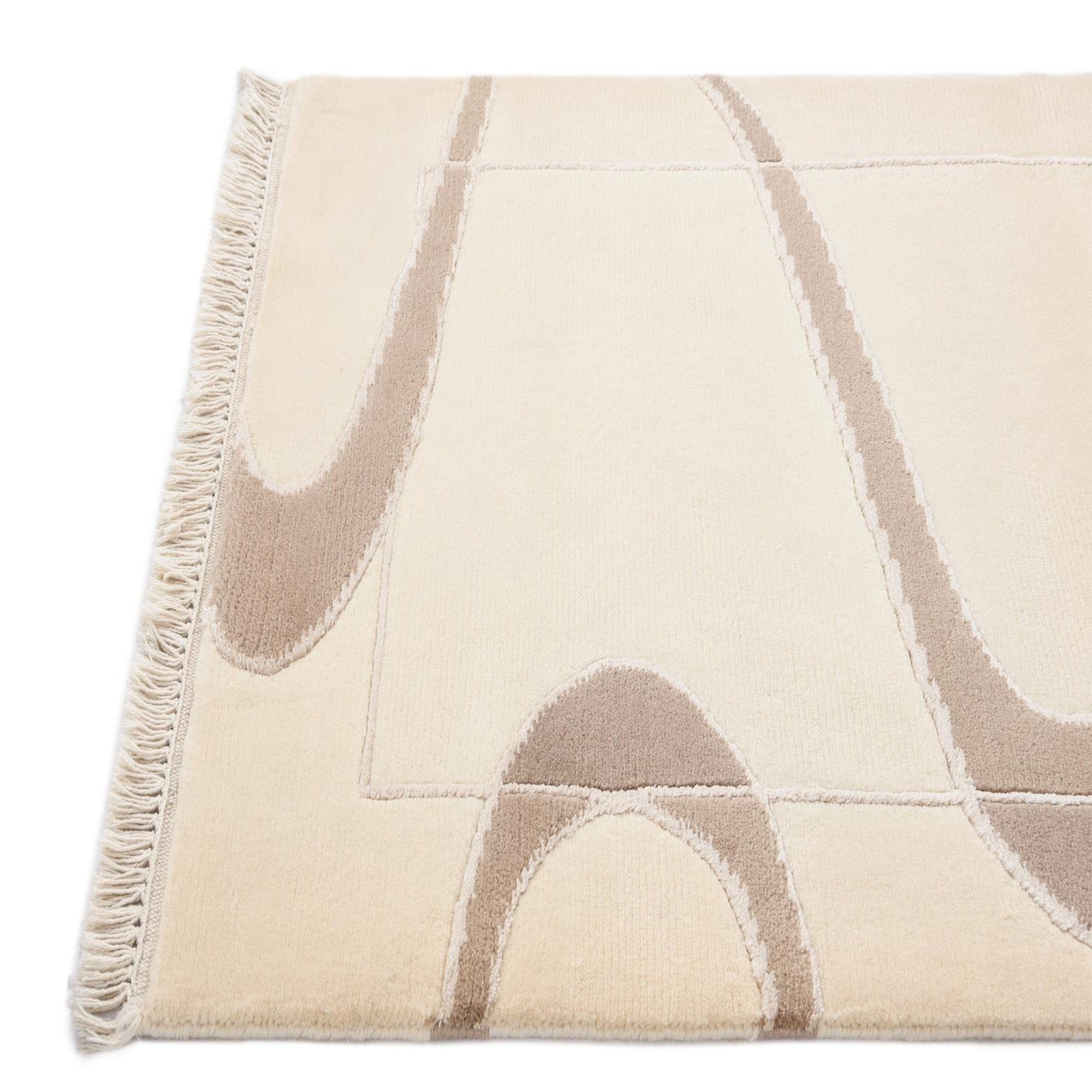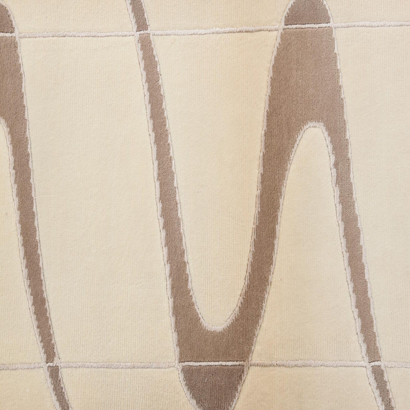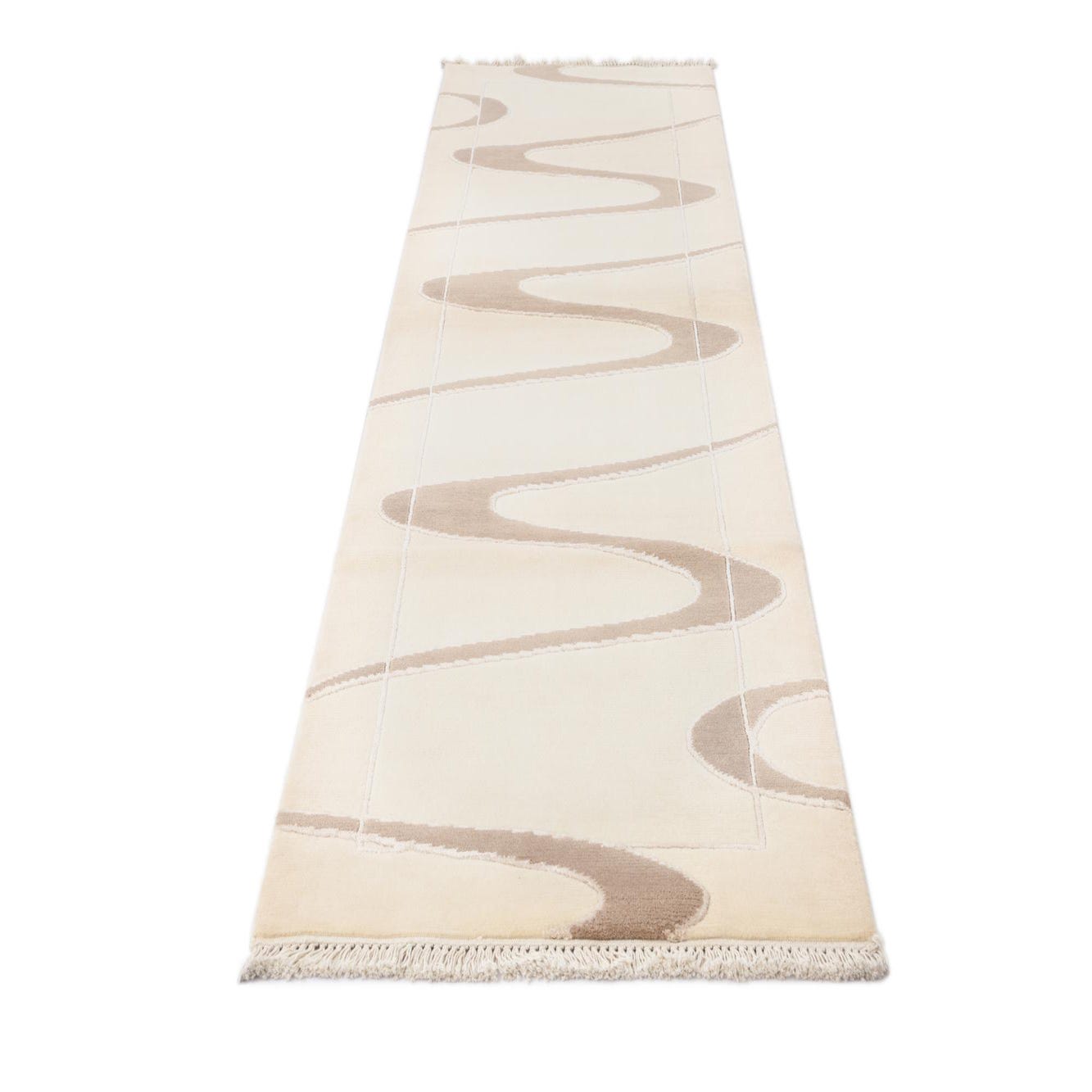 Hand-knotted of 100% wool, this runner has a light cream ground punctuated by a flowing, ribbon-like motif in light brown with ivory edging. The pattern moves lengthwise in soft S-curves, framed by faint linear panels that give the design a structured, modern feel. The pile is dense and low, with the light-brown motif slightly raised to create a subtle sculpted texture against the smooth cream field; finished fringe on the ends adds a classic touch.