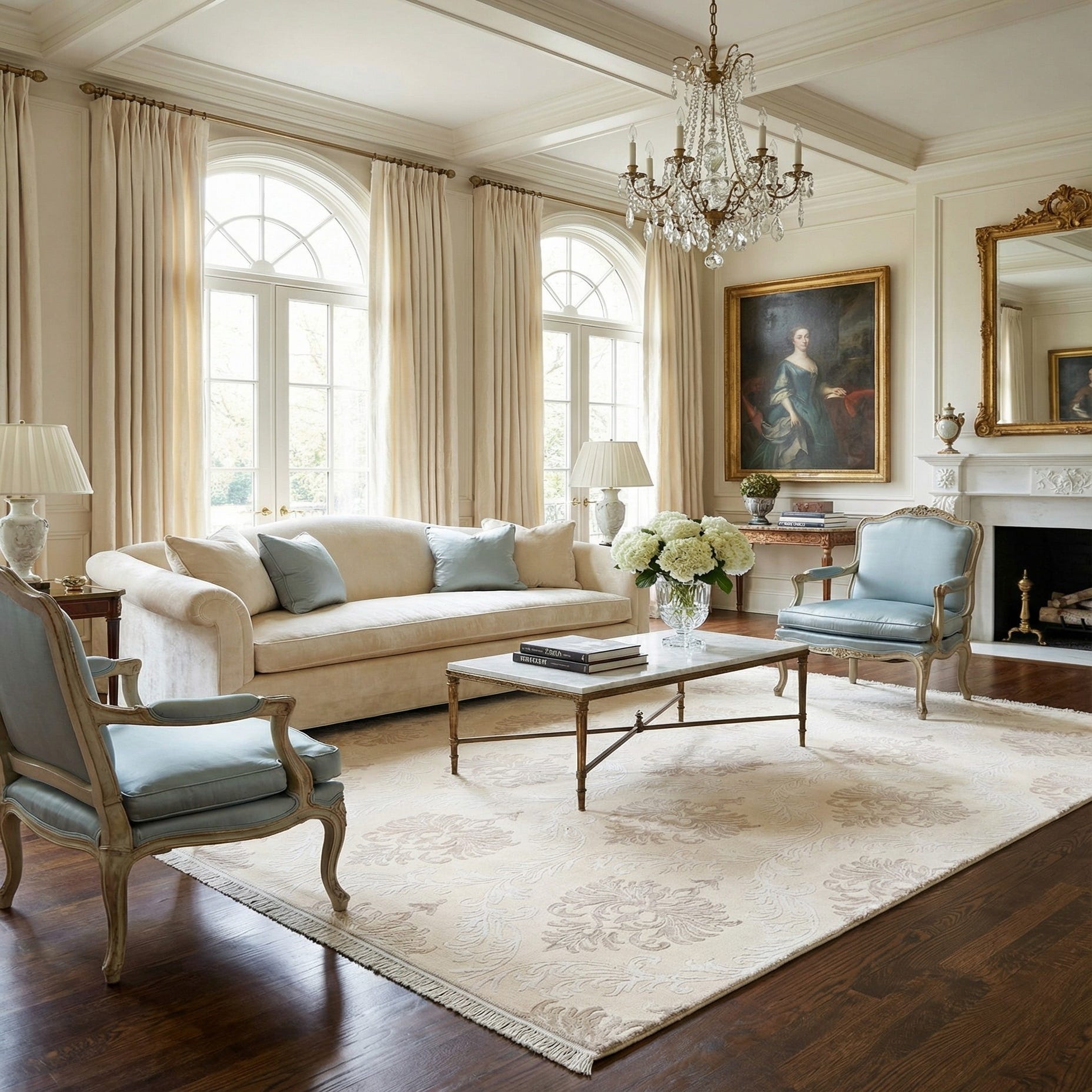 This rug's classic color palette and sophisticated pattern make it versatile for various interior design scenarios. It would serve as an anchor piece in a formal living room, complementing neutral or monochromatic color schemes. Its understated elegance also makes it an excellent choice for a chic bedroom where its plush texture can add a layer of warmth and comfort.