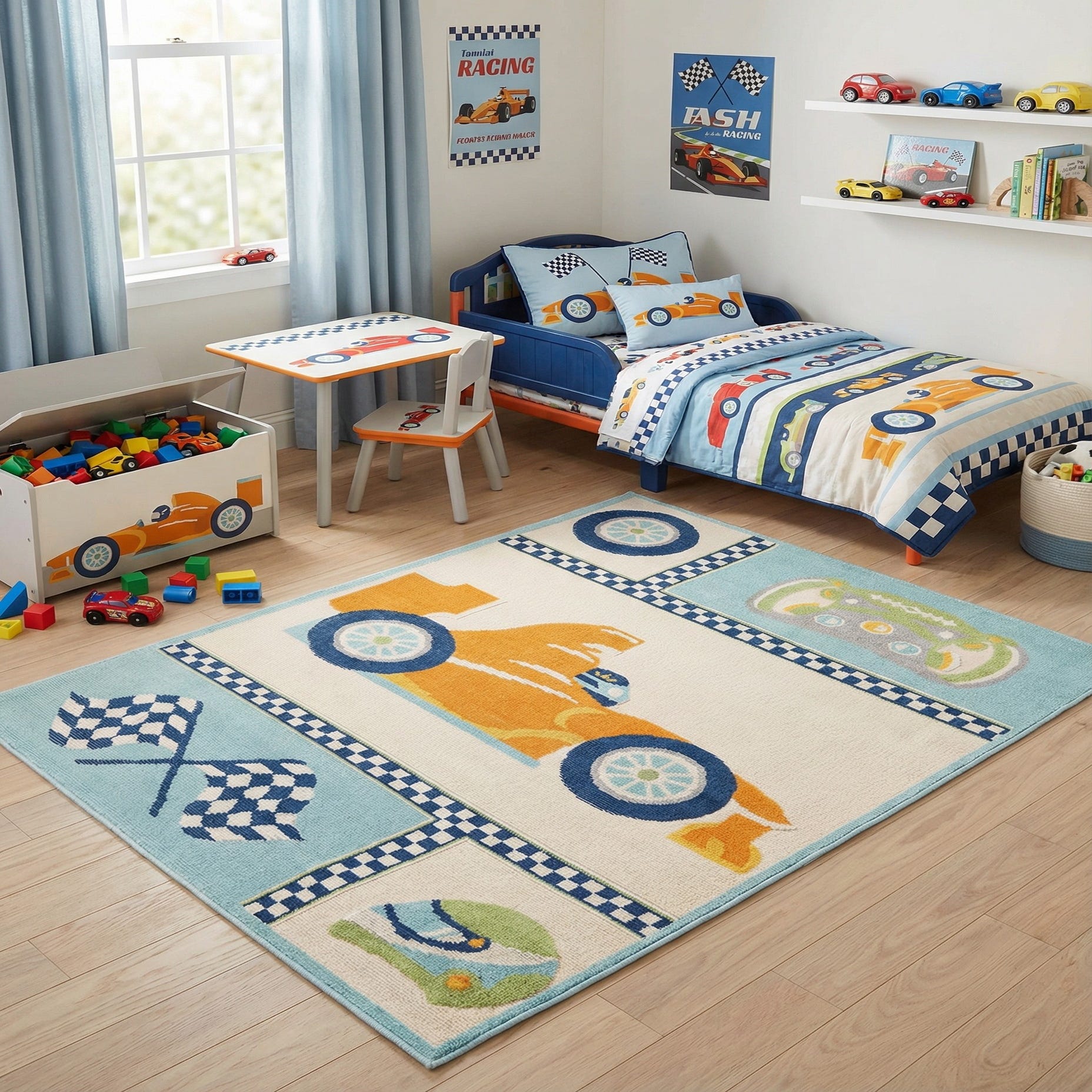 A 5x8 rectangular rug with a light cream background featuring an orange race car, racing flags, a helmet, and a steering wheel, bordered by a checkerboard pattern.