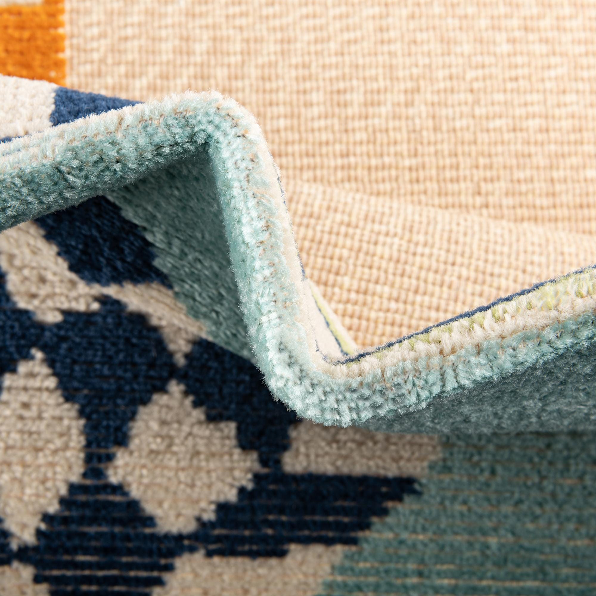 Primary color is Light Cream. Colors in this rug include: Light Cream, Blue, Gray, Ivory, Light Blue, Navy Blue, Yellow, Orange, Green.