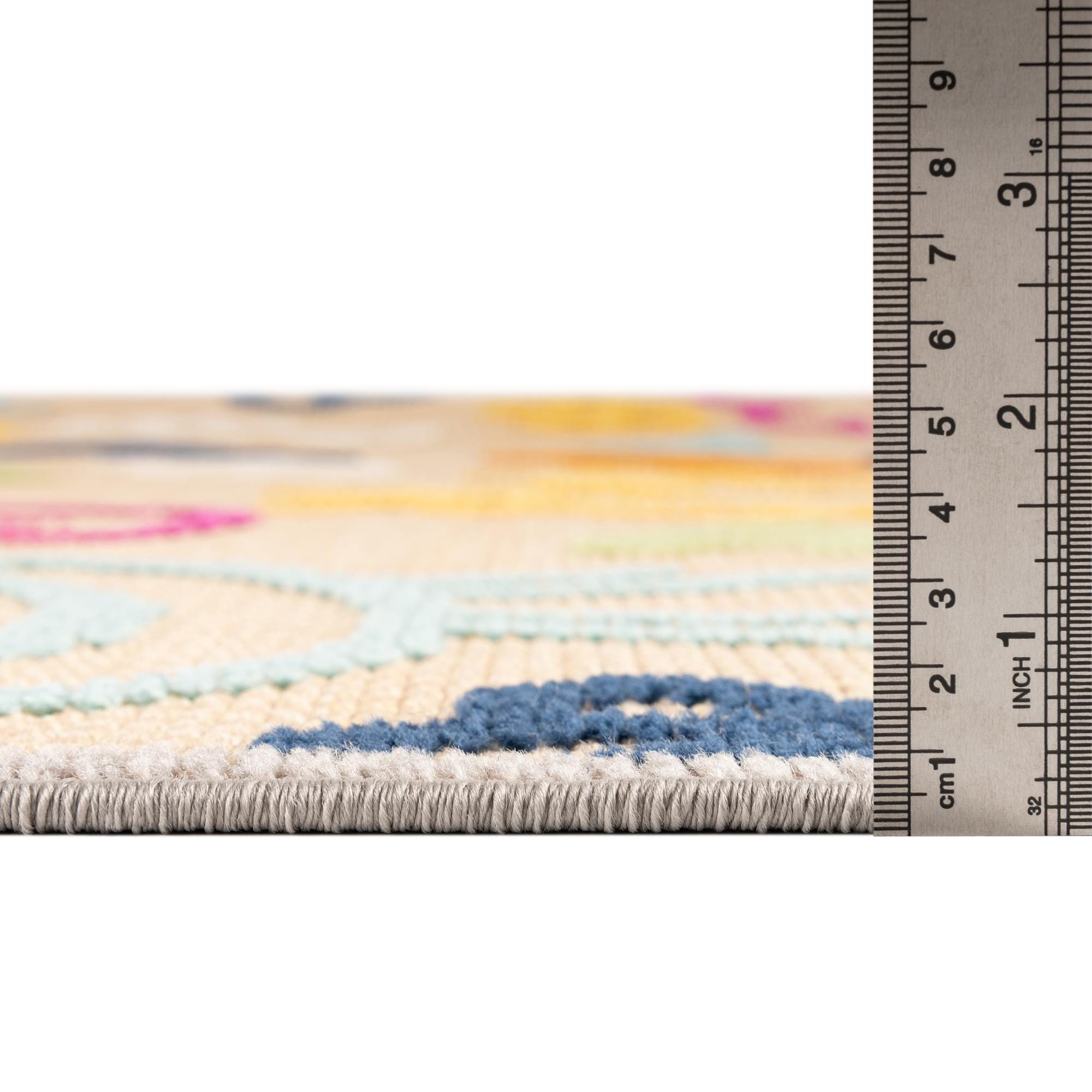 This rug's friendly, contemporary vibe works well in kid-focused spaces like playrooms and nurseries, and it can add a bright, relaxed touch to family rooms, sunrooms or covered porches. Pair it with white or natural wood furniture, navy or denim accents, and soft pastel textiles to reinforce the playful palette and casual style.