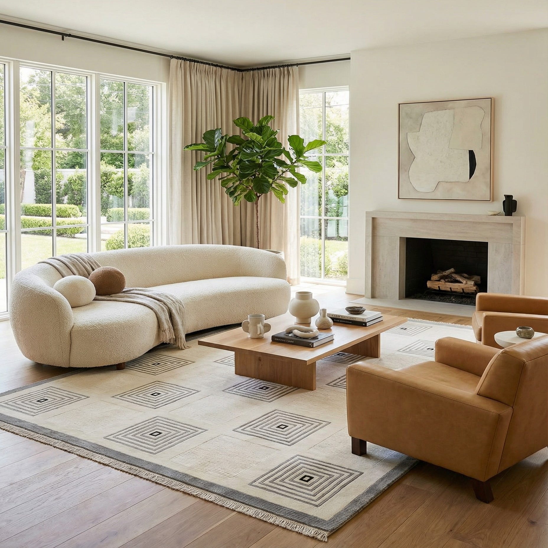 The design provides a contemporary aesthetic that can effortlessly integrate into a variety of interiors. Thanks to its neutral color palette, this rug is versatile enough for a minimalist setup, accentuating clean lines and understated elegance. Alternatively, it can serve as a grounding element in a more eclectic space where its geometric precision can contrast playfully with more organic shapes and textures. For a professional setting or a home office, the structured pattern of this rug can add a sense of order and sophistication.