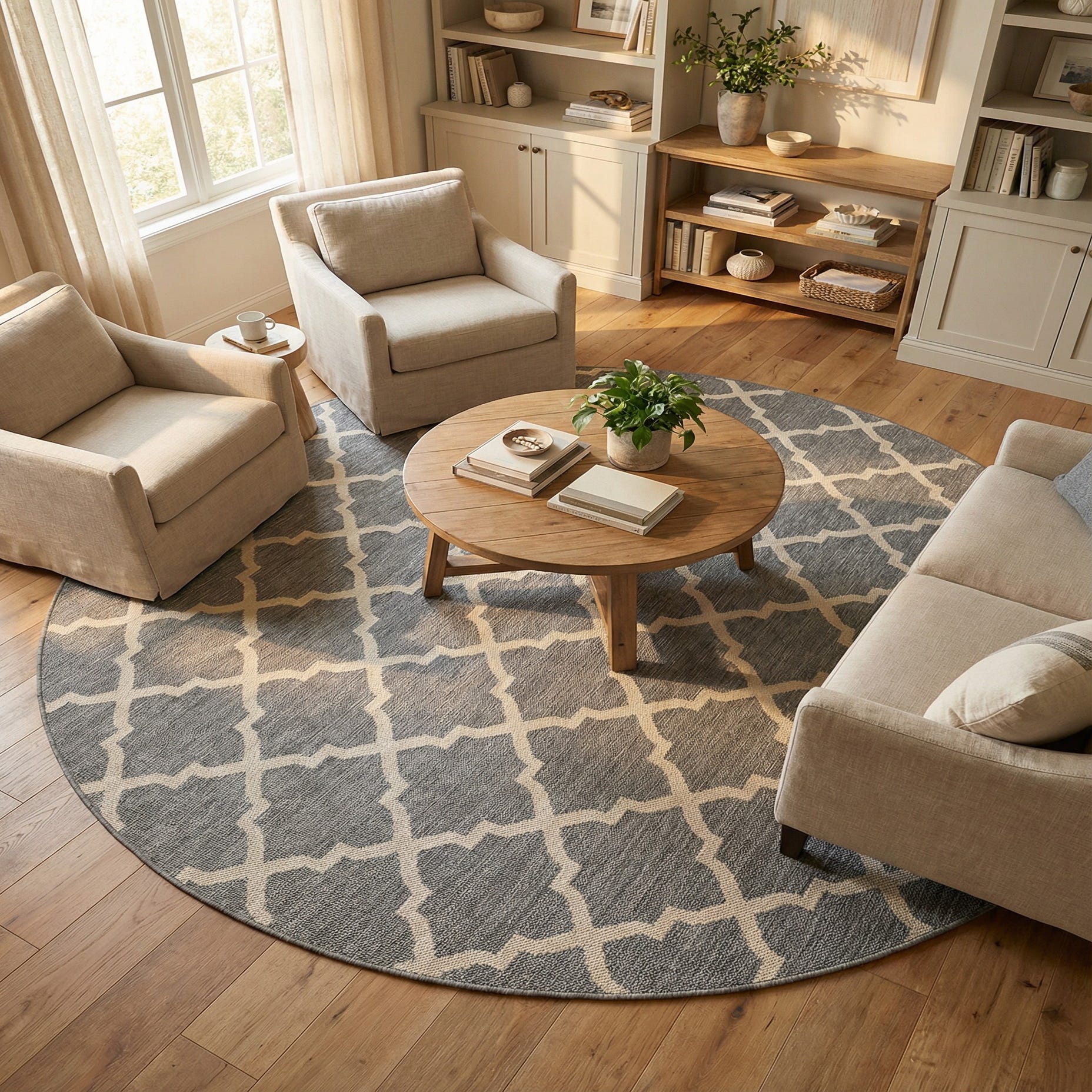 A round rug in a light gray field with a repeating Moroccan quatrefoil trellis in warm beige. The balanced geometric pattern gives the surface a calm, ordered look while the low, dense pile invites touch—smooth and supportive underfoot with a subtle, synthetic sheen. Machine made of 100% polypropylene, this piece lays flat and keeps its pattern crisp for a clean, tailored appearance.