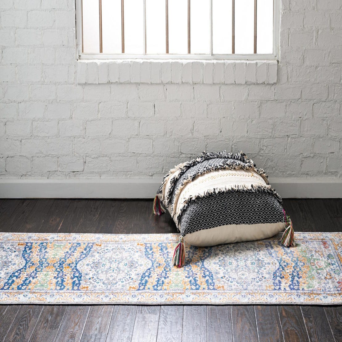Primary color is Light Gray. Colors in this rug include: Light Gray, Blue, Gold, Green, Red, Pink.