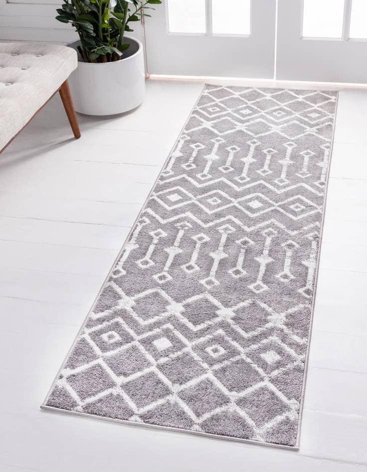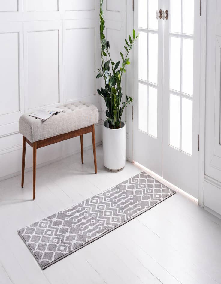 A 10 ft runner rug in shades of gray and silver with a modern tribal trellis pattern, perfect for a hallway.