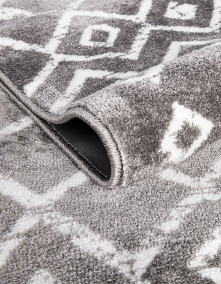 A soft, low-density pile crafted from 100% polypropylene gives this runner a smooth, slightly cushioned hand that feels comfortable underfoot while holding a clean, tailored appearance. The light gray background sets a calm, neutral field for an ivory geometric trellis pattern: interlocking diamonds move across the center while vertical, arrow-like motifs punctuate the ends, creating a balanced, rhythmic layout. The contrast between the pale ivory pattern and the subtle sheen of the polypropylene pile keeps the design readable without overpowering a space.