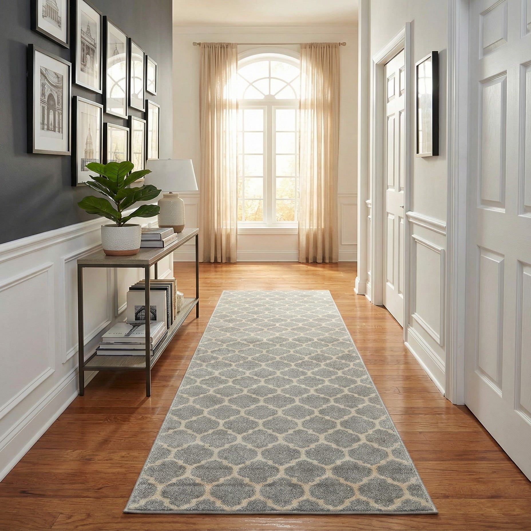 A 10 ft runner rug in shades of gray and silver, featuring a modern trellis pattern, perfect for a hallway.
