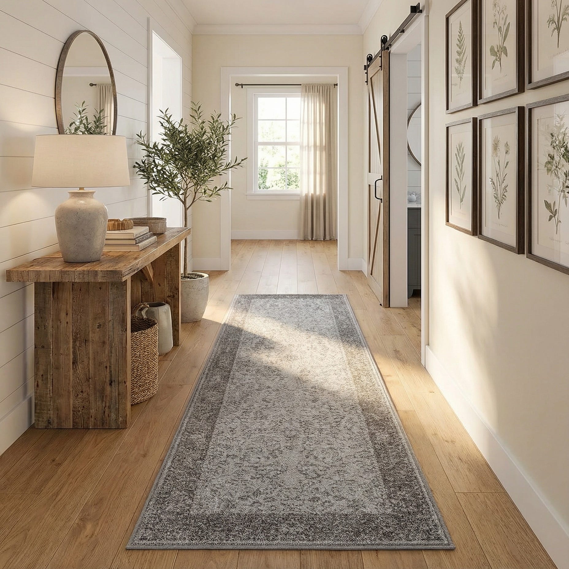 This runner works well in transitional and modern interiors where a neutral foundation is needed — think a hallway beneath console tables, a kitchen runner between islands, or a narrow entry that benefits from a muted, refined anchor. Pair it with cool wood tones, stainless finishes, or layered textiles in charcoal and soft white to maintain a calm, cohesive palette.