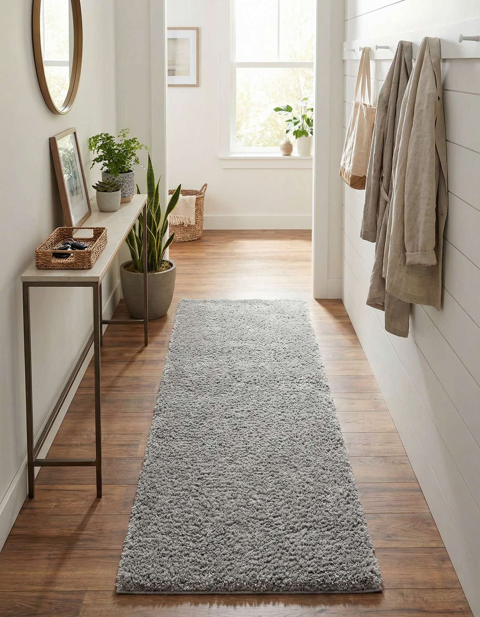 Machine-made from 100% polyester, this runner works well in long, narrow spaces where a soft underfoot layer is needed. Use it to warm a hallway or entry, line the side of a bed, or create a cozy path through an open-plan living area. It pairs naturally with Scandinavian or contemporary interiors, light wood tones, and cool metal accents, and it complements layered textures like linen throws or leather seating for a relaxed, modern feel.