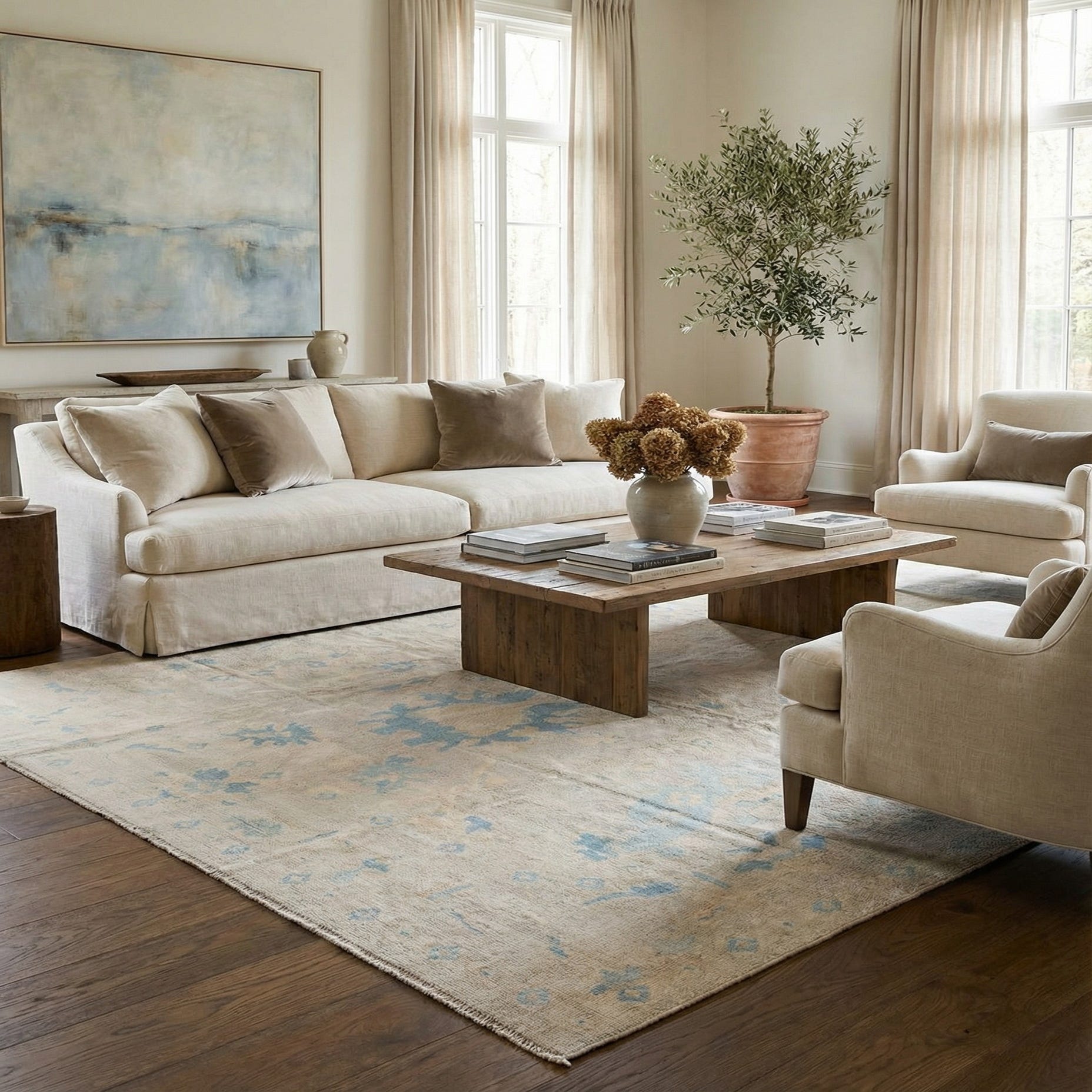 A large 10x13 rectangular gray wool rug with a subtle traditional pattern in light blue and beige tones.
