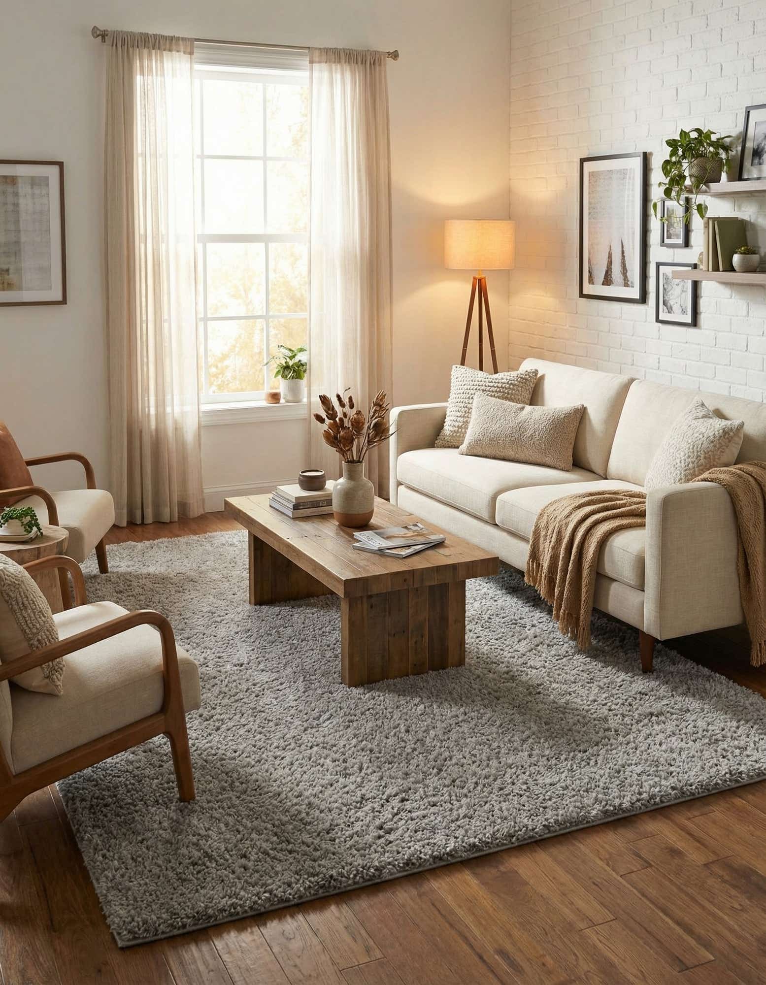Works well under a low-profile sectional or layered at the foot of a bed to create a cozy, modern foundation, and it pairs naturally with Scandinavian, transitional, or minimalist interiors. Use it to warm wood or tile floors in a living room, soften a reading nook, or add texture to a home office without competing with patterned furnishings.