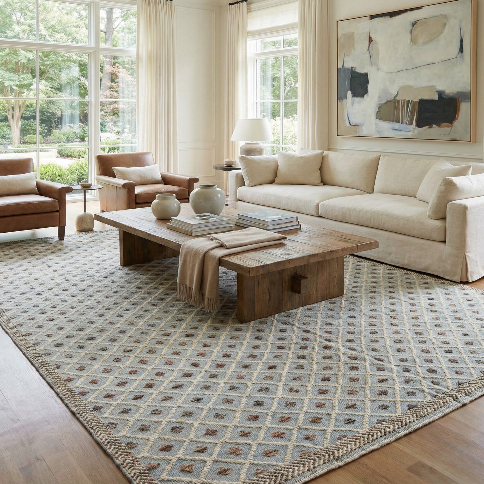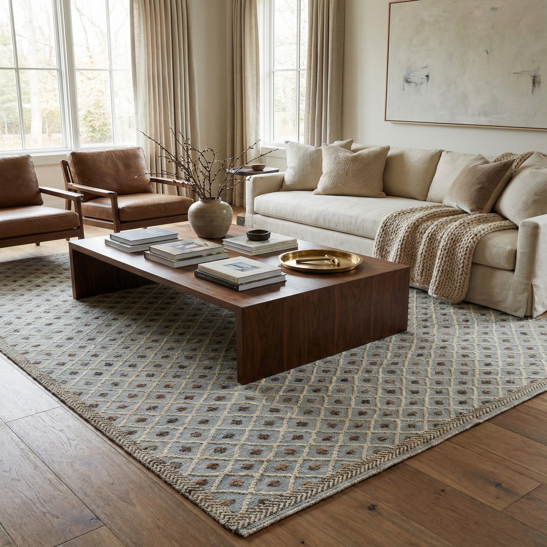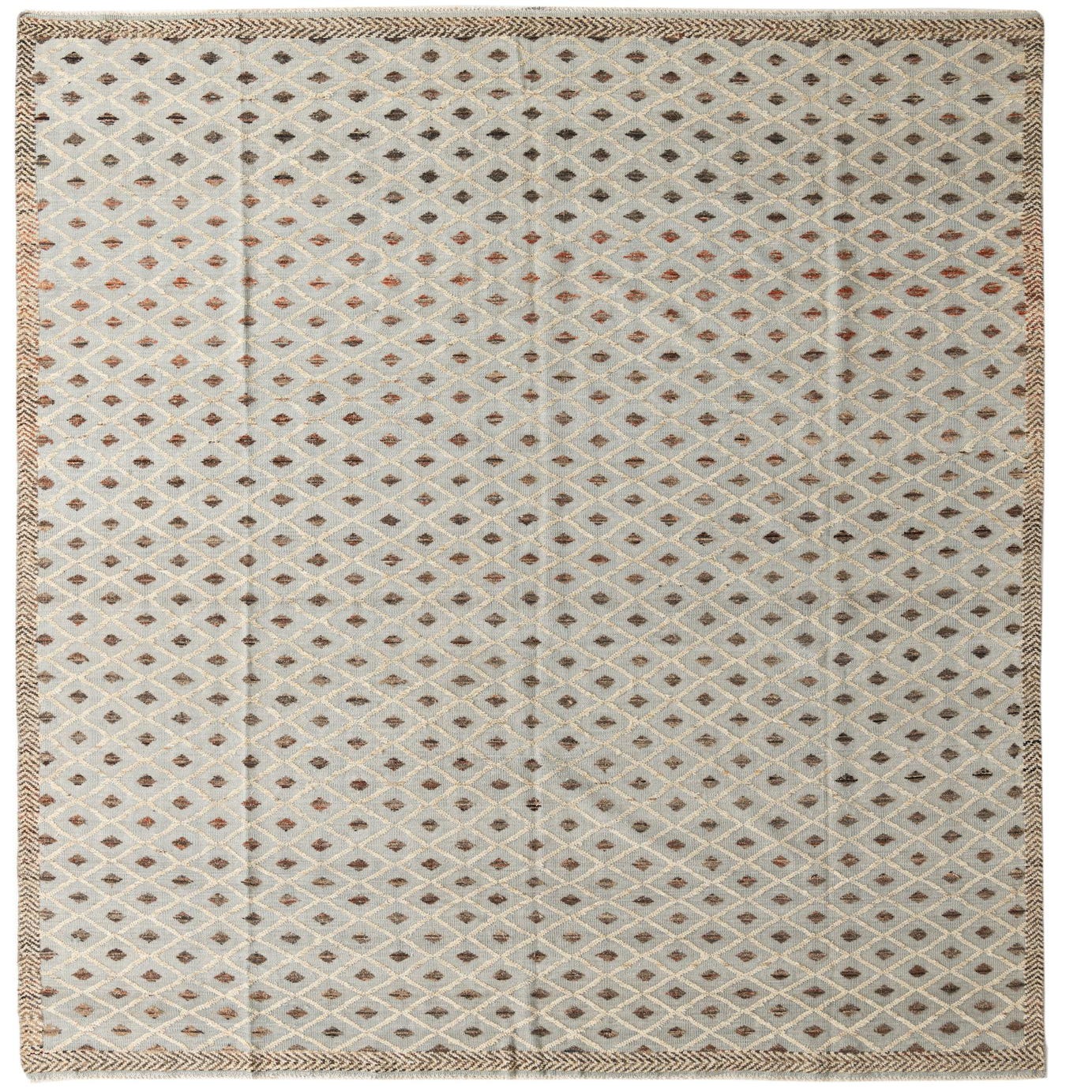 With its subdued color palette and elegant geometric pattern, this rug is suited for a variety of interior scenarios. It can serve as a refined foundation in a minimalist setting, where its pattern can stand as a focal point, or it can be integrated into a more traditional space, where its classic design harmonizes with rich wood tones and sumptuous fabrics. For a contemporary twist, this rug could be juxtaposed against sleek modern furnishings to create an interesting contrast between old and new.