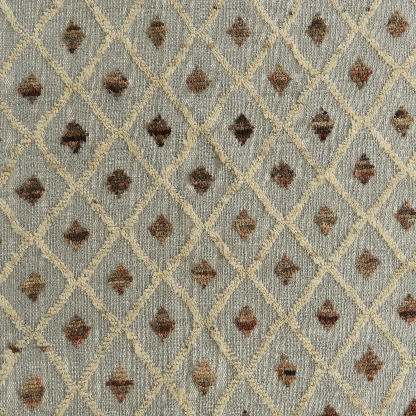 The Darya collection presents a hand-knotted rug crafted from 100% wool, measuring 10 by 14 feet, designed to anchor any room with its durable construction and timeless appeal. This particular piece features a harmonious combination of light gray, brown, and ivory tones, with the light gray providing a serene background that allows the pattern to stand out gracefully. The design showcases a systematic lattice of diamond motifs, each encasing subtle geometric detailing that adds depth and texture to the rug's overall visual interest.