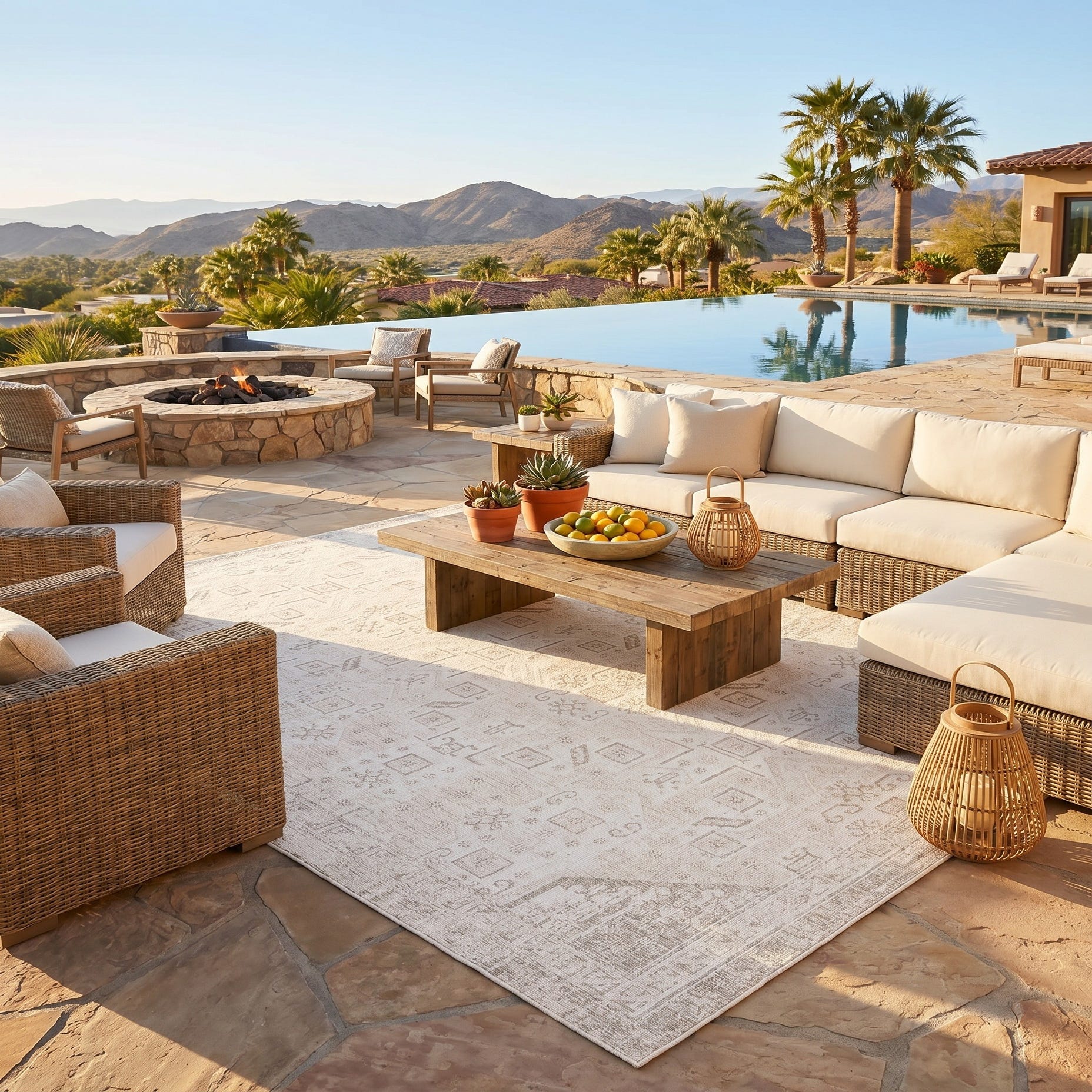 Loved this piece pictured and it arrived fast and looked exactly as pictured. We picked the square sized 7’10 and it fit perfect in the space. While I can’t say as of yet how it fares with wear and tear this is my second purchase of an outdoor rug from rugs.com and my first rug weathered the seasons amazingly. Still in perfect condition a year later and only replaced with this one because I wanted to add a little more color.