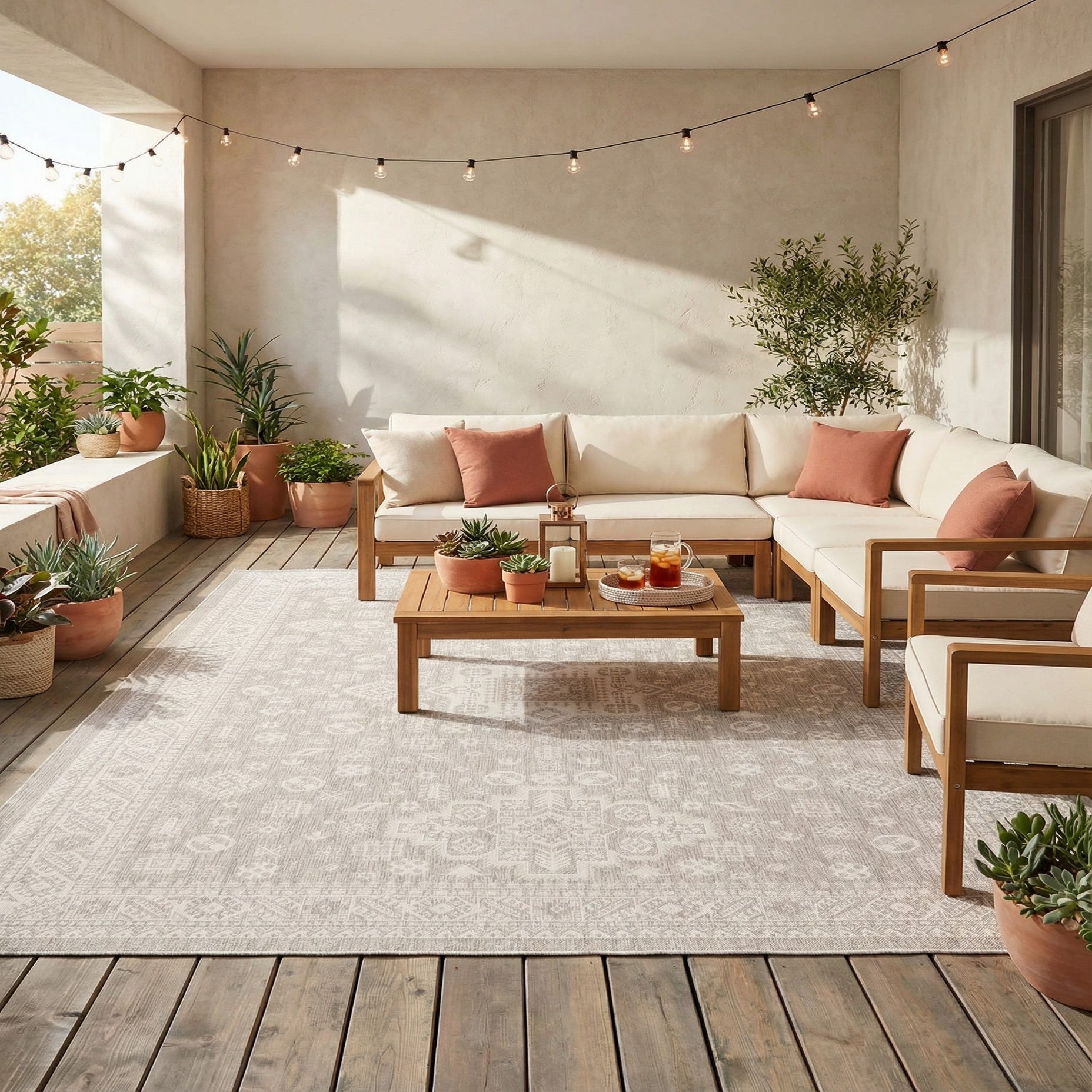 In terms of interior design scenarios, this rug pairs well with minimalist, Scandinavian, or contemporary décor themes, or it could be used to soften industrial elements with its gentle hues and inviting pattern. The size and scale of the rug make it an excellent choice for anchoring furniture groupings in expansive outdoor entertaining areas.