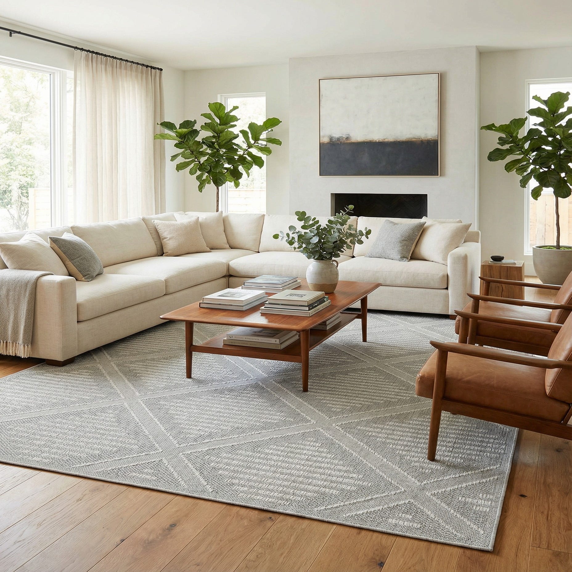 This neutral palette and clean pattern work well in both outdoor living spaces and indoor rooms that favor a relaxed, modern aesthetic. Place it beneath a dining set on a covered patio, layer it in a sunroom with wicker and light-wood furnishings, or use it to anchor a bright, minimal living room with white linens and steel-framed accents. It also pairs nicely with coastal or Scandinavian interiors where soft grays and simple geometry complement natural materials and streamlined furniture.