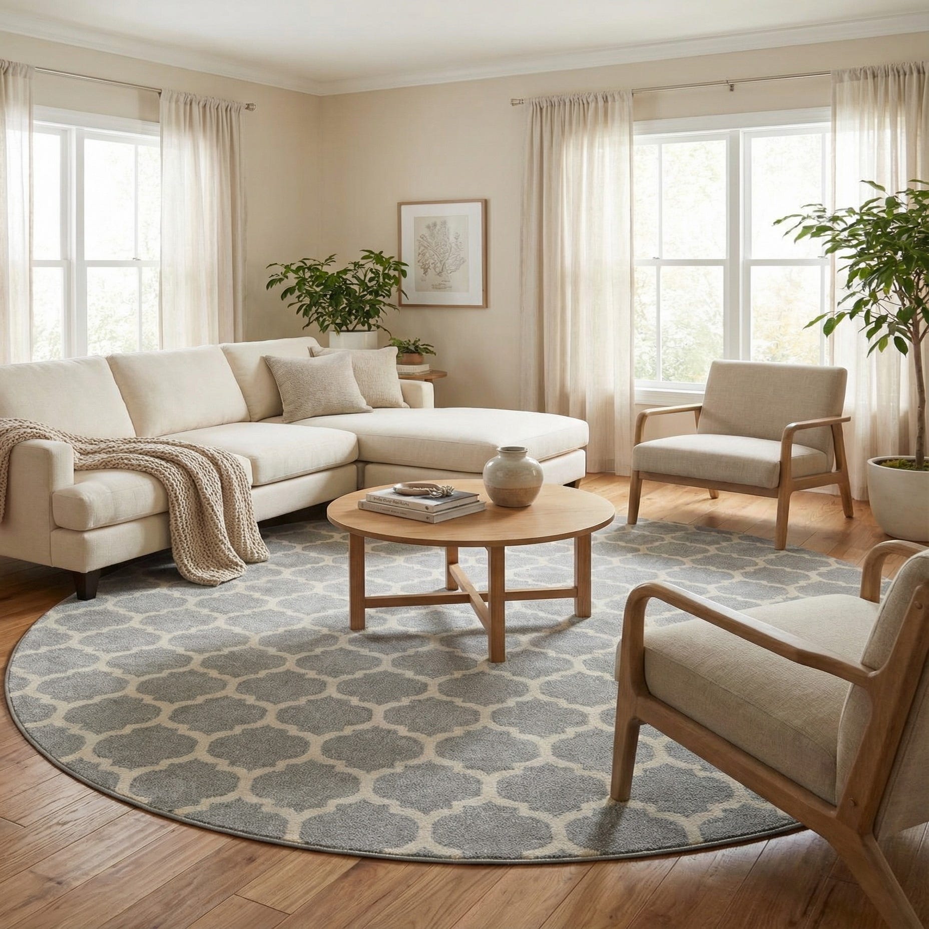 The neutral palette and classic pattern make this piece versatile across many rooms. It pairs well with cool metals and pale woods for a contemporary living room, anchors a round dining table for a cohesive dining area, or layers beneath a bed to introduce pattern without overwhelming soft linens. Durable polypropylene construction makes it a practical choice for entryways, family rooms, or home offices where you want style that stands up to daily use.