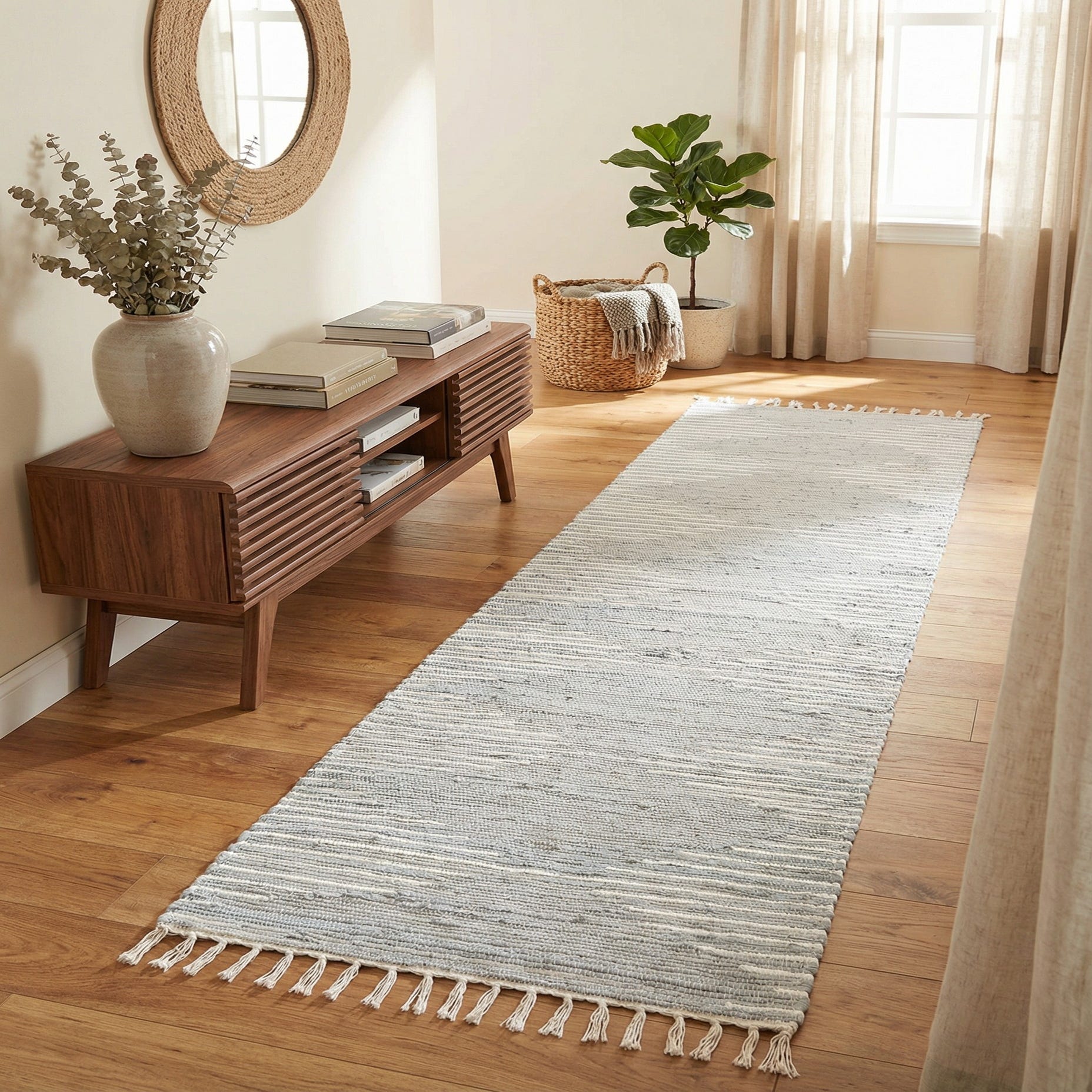 The flat-woven construction has a low profile and a tactile, slightly nubby surface you can feel beneath your feet — soft cotton loops with a bit of braided texture from the hand weaving. This runner works well in hallways and entryways, alongside kitchen counters or sofas, or layered over a larger area rug in living rooms and bedrooms. Its neutral light gray and ivory palette suits modern farmhouse, Scandinavian, coastal, or minimalist spaces that favor quiet texture and practical style.