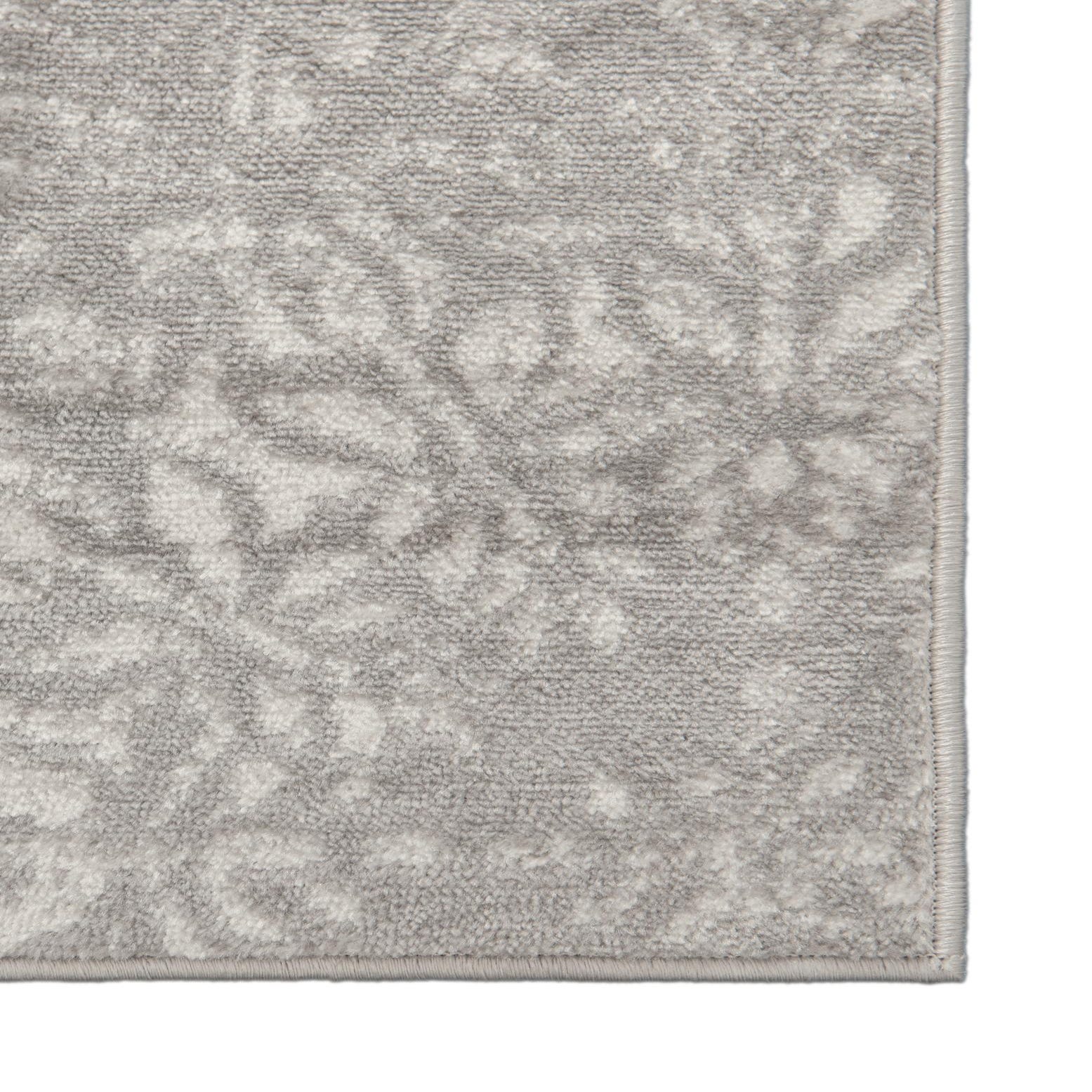 A distressed medallion runner in light gray and ivory, this machine-made rug is crafted from 100% polypropylene. The light gray background carries a sequence of faded floral and ornamental medallions, with ivory accents forming delicate scrollwork and small star-like motifs. The low-profile pile feels smooth and slightly dense underfoot, and subtle variations in pile height give the surface a soft, worn texture that highlights the vintage-inspired pattern without overpowering a space.