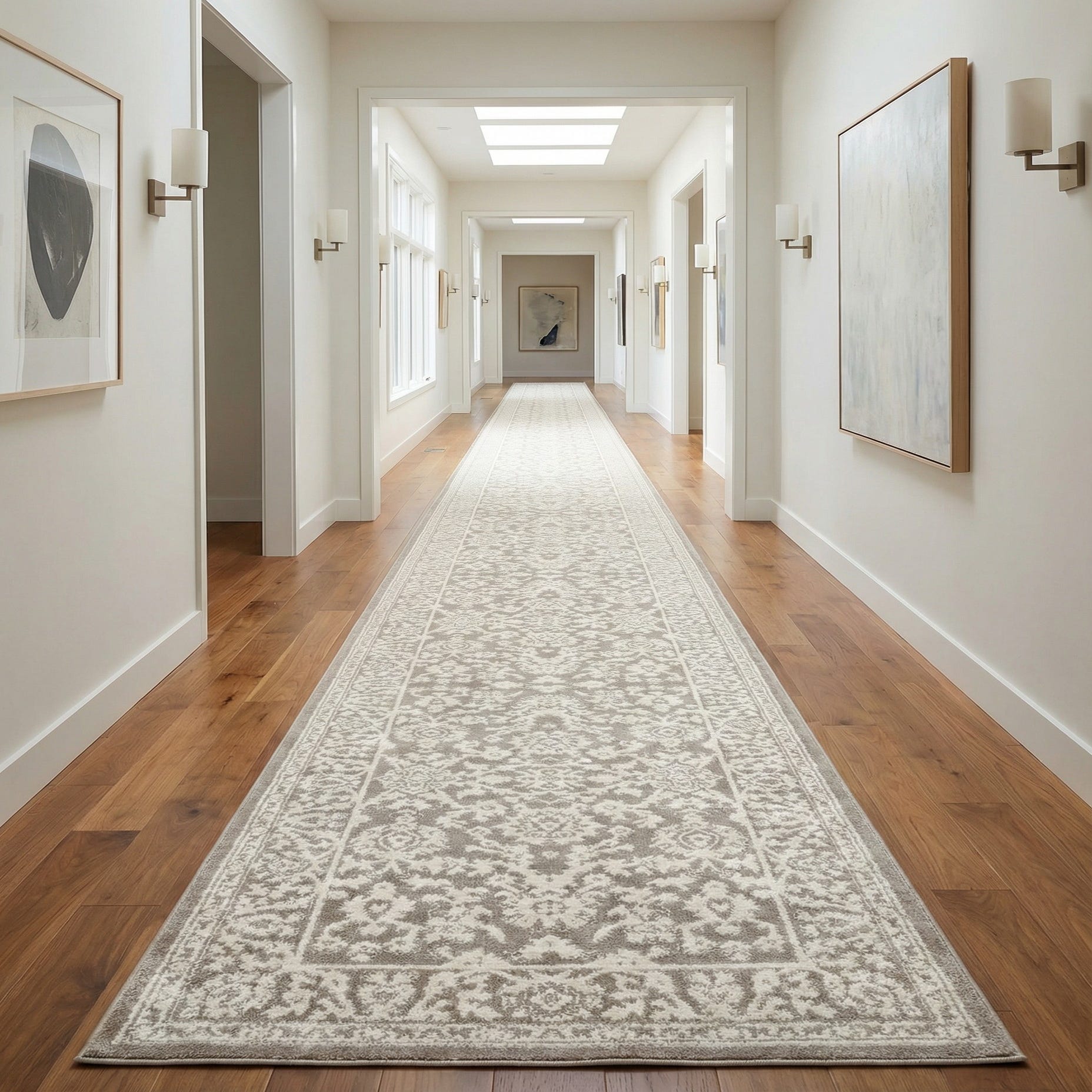 A classic floral-and-medallion pattern is woven in ivory over a light gray background, creating a balanced, traditional look with a contemporary calm. The central field is filled with stylized blossoms and scrolling vine motifs, framed by a slim, patterned border that gives the runner a tailored, finished edge. The two-tone palette keeps the design airy and versatile without overwhelming a narrow space.