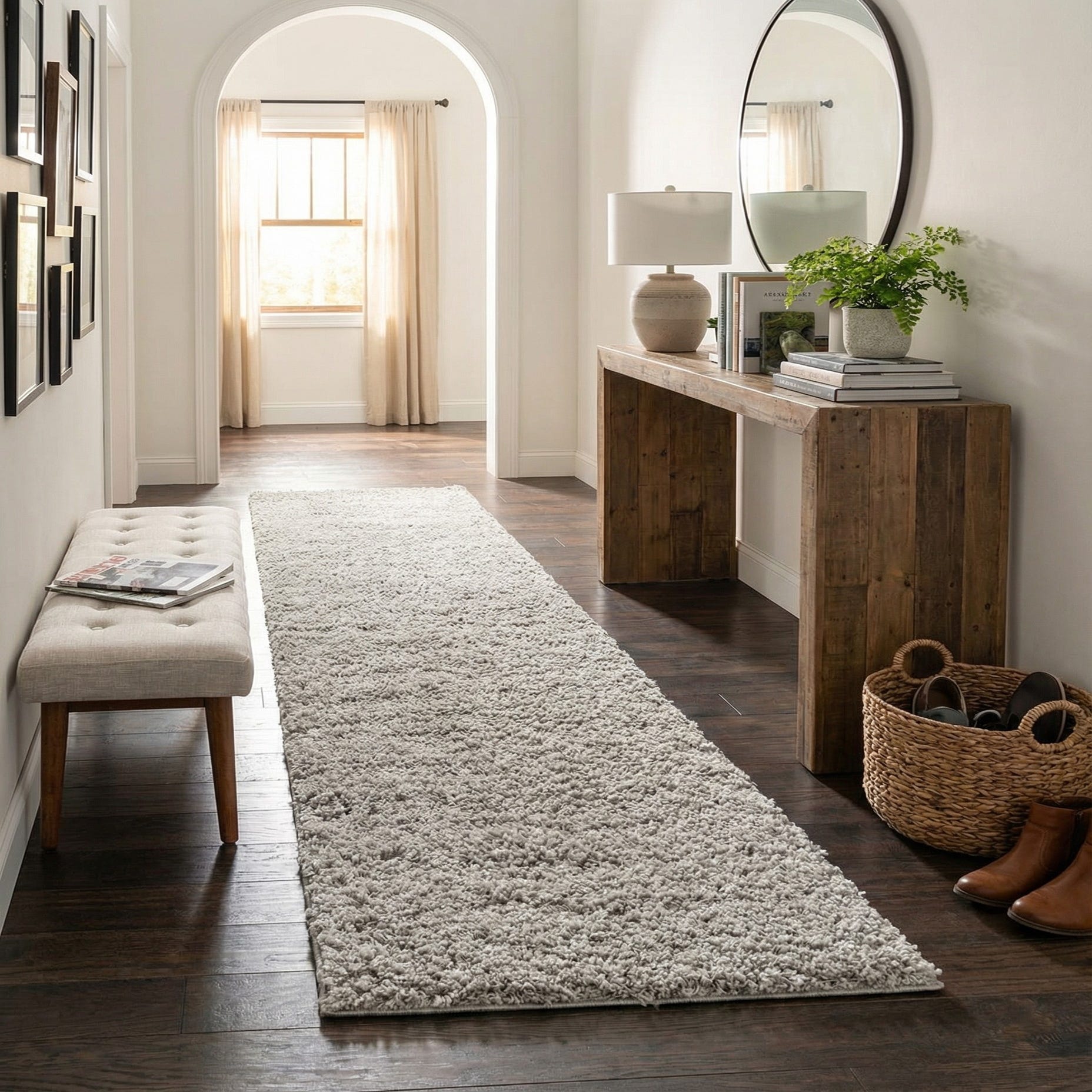 This runner works well in narrow, lived-in spaces—lay it along a hallway, between kitchen counters, or at the foot of a bed to add a cushioned underfoot layer. Its understated color and simple shag profile complement modern, Scandinavian, or transitional interiors, and it pairs especially nicely with light wood floors, metal accents, and soft textiles for a calm, cohesive look.