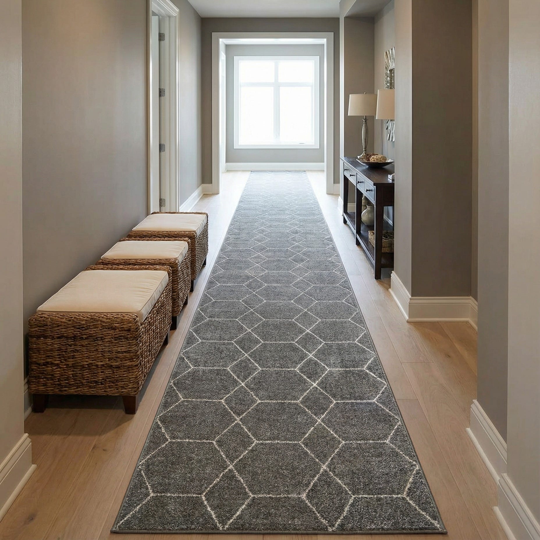 A 16 ft gray runner rug with a repeating modern white trellis pattern, perfect for a hallway.