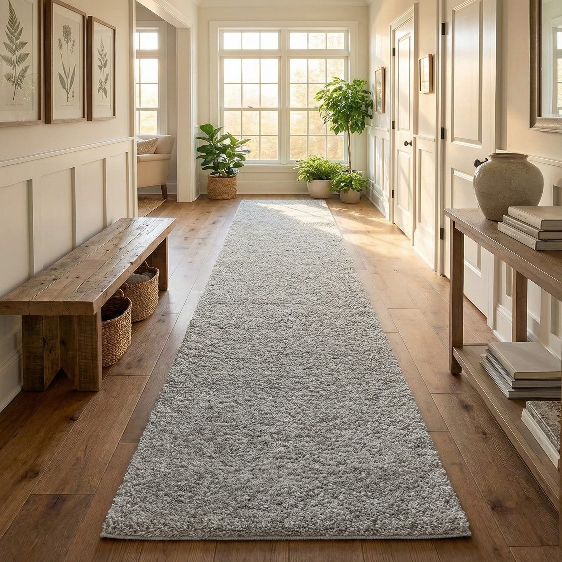A long, dense shag in Light Gray with a uniform, solid pile—this runner relies on texture rather than pattern. The deep, plush fibers create subtle tonal variation as they catch the light, producing a soft, tactile surface that cushions each step. The overall look is casual contemporary: simple, cozy, and focused on feel rather than ornament.