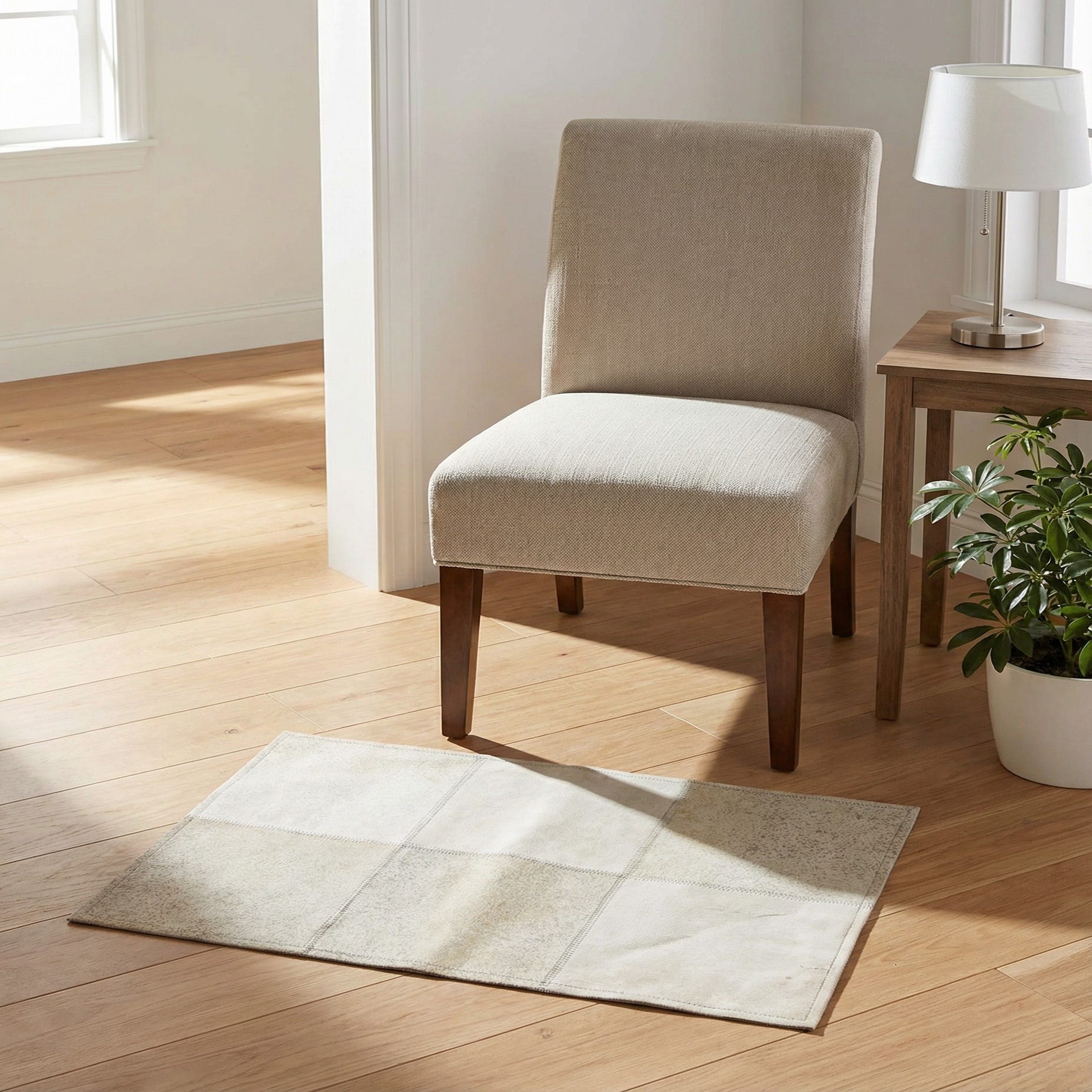 Strategically stitched to create a cohesive pattern, the patchwork design embodies a contemporary aesthetic with a hint of rustic charm. This rug's versatility makes it an excellent choice for an array of decor scenarios, from modern urban lofts to cozy, eclectic living spaces. It would serve as an elegant focal point beneath a coffee table, elevate the look of a home office with its refined texture, or add a layer of comfort to a small seating area.