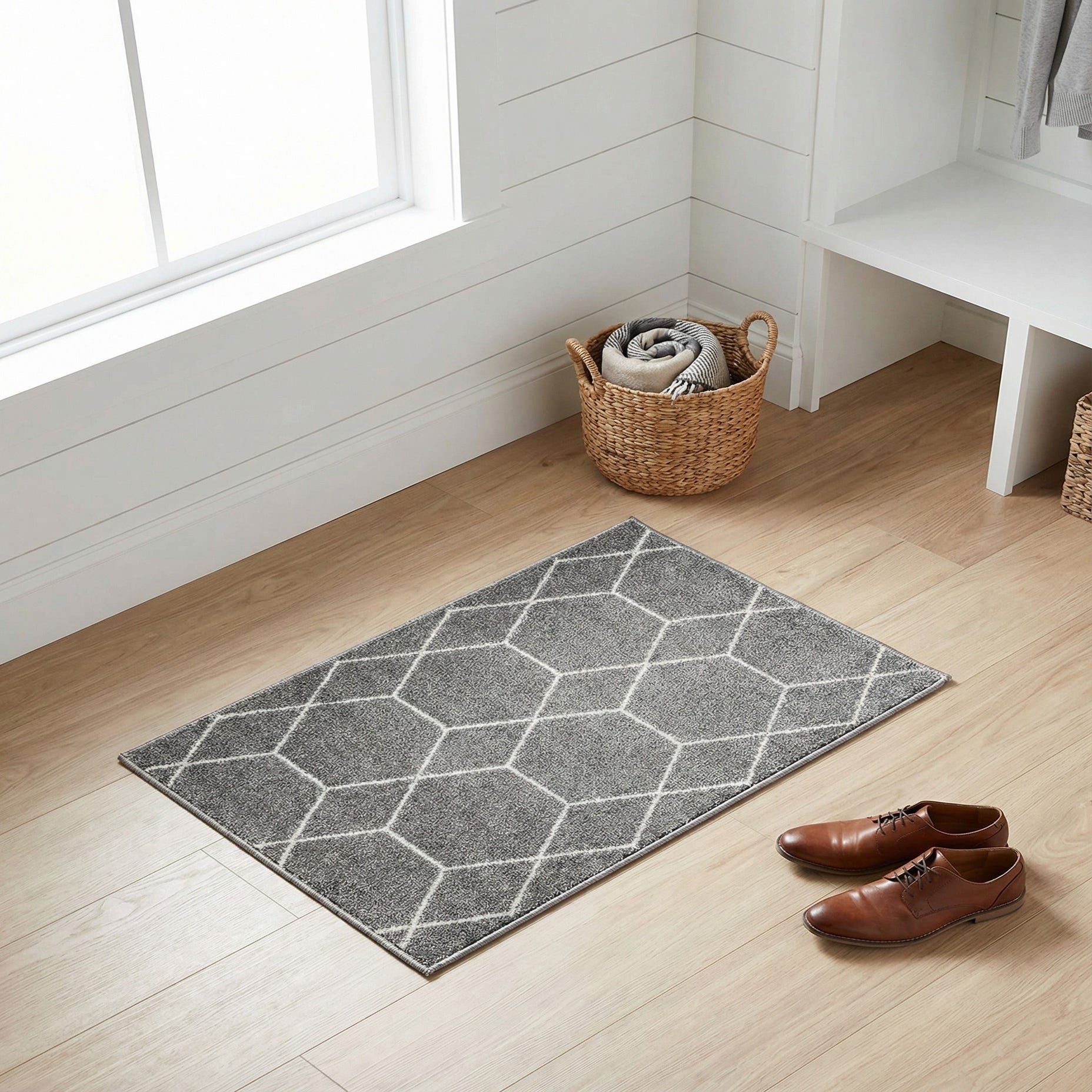 The neutral light gray and ivory palette works well with a range of decor styles — from modern and Scandinavian to transitional and industrial. Place it at an entry, in front of a desk, beside a bed, or layered over hardwood to add pattern without overwhelming the room. Finished with short fringed ends, the rug brings a casual, tailored touch that complements light wood, white or chrome accents, and pared-back furnishings.