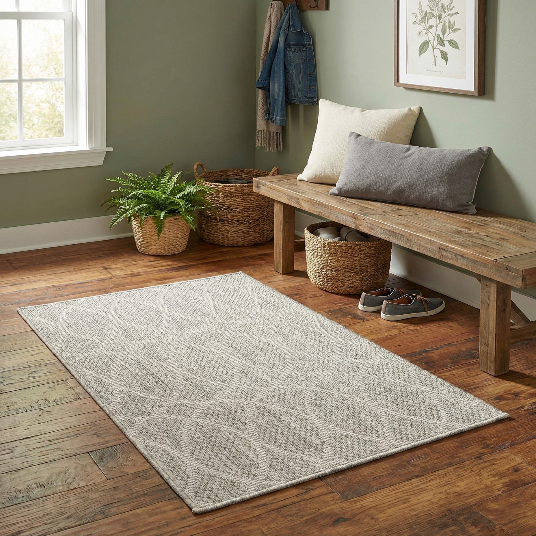 In terms of coloring, the rug features a light gray background with an ivory pattern offering a neutral color palette that complements various decor styles. The texture of the rug is smooth and flatweave, catering to a contemporary aesthetic. Its stain-resistant and shed-free properties ensure durability and low maintenance, suitable for high-traffic areas.