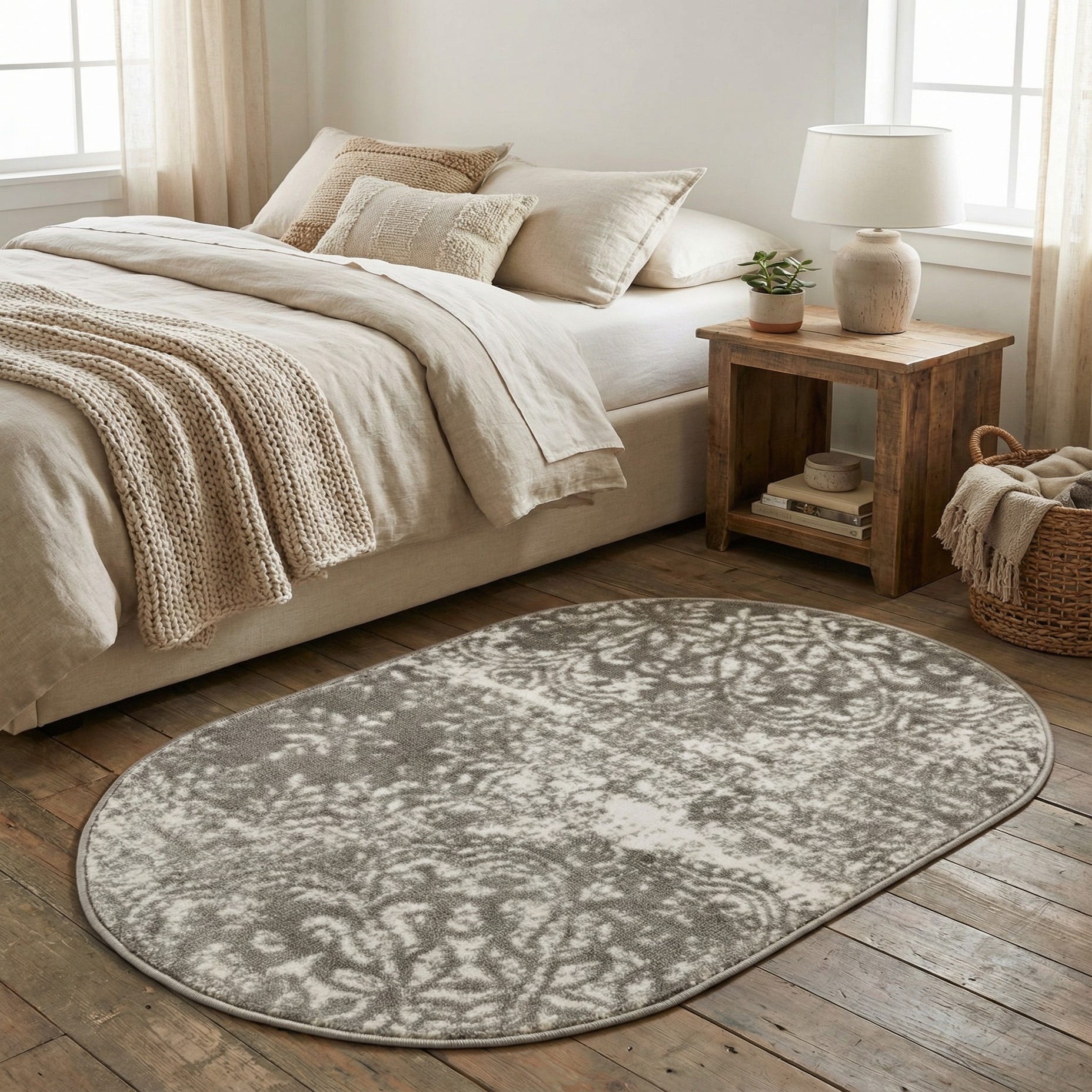 Made from 100% polypropylene, the rug has a low, dense pile that feels smooth and slightly plush underfoot. Running your hand across the surface reveals a tight, machine-woven texture that holds the pattern definition while remaining comfortable. This oval style is well-suited to small-format placements—think in front of a console or vanity, beside a bed, or anchoring a compact seating nook—where the neutral Light Gray and Ivory palette can blend with both cool and warm interiors.