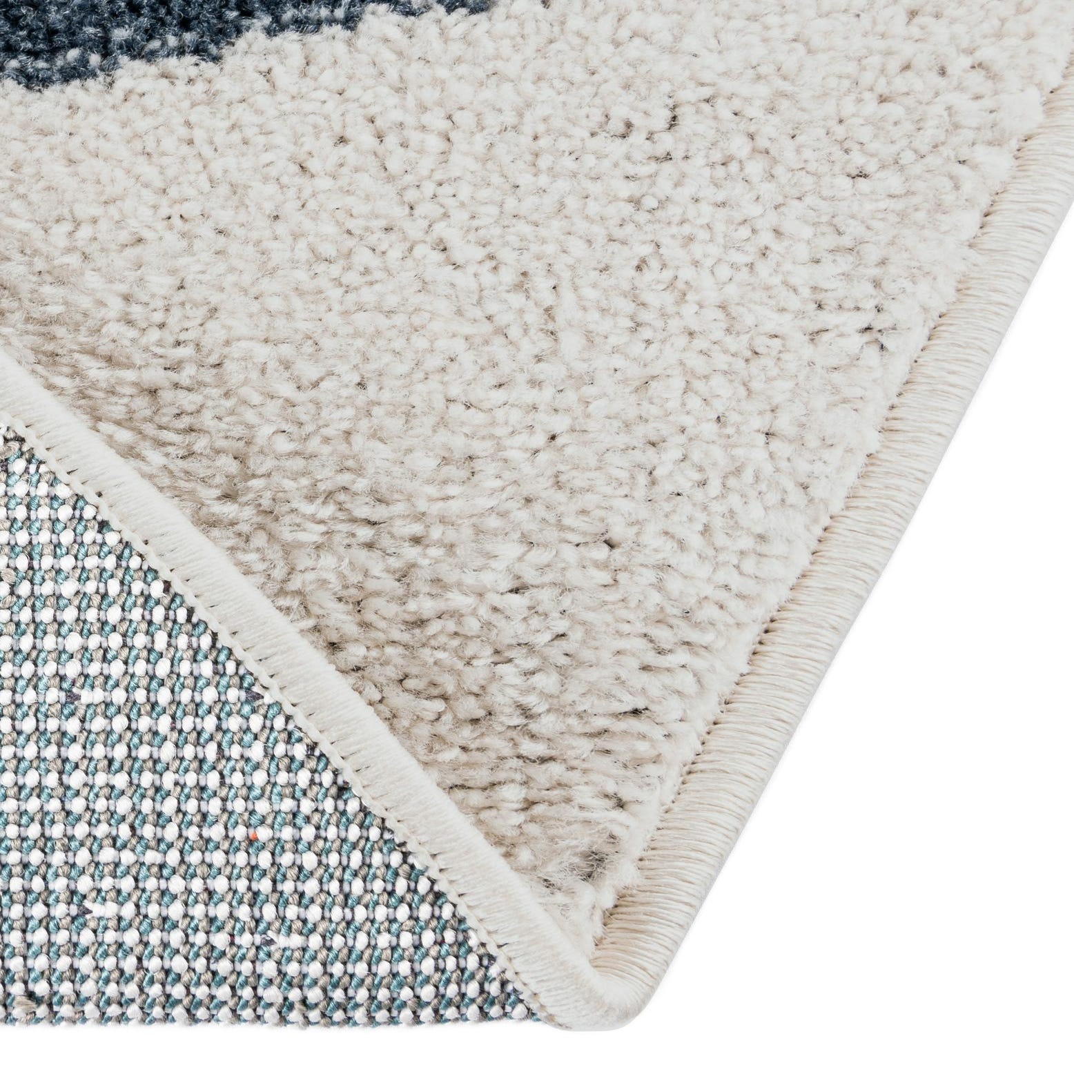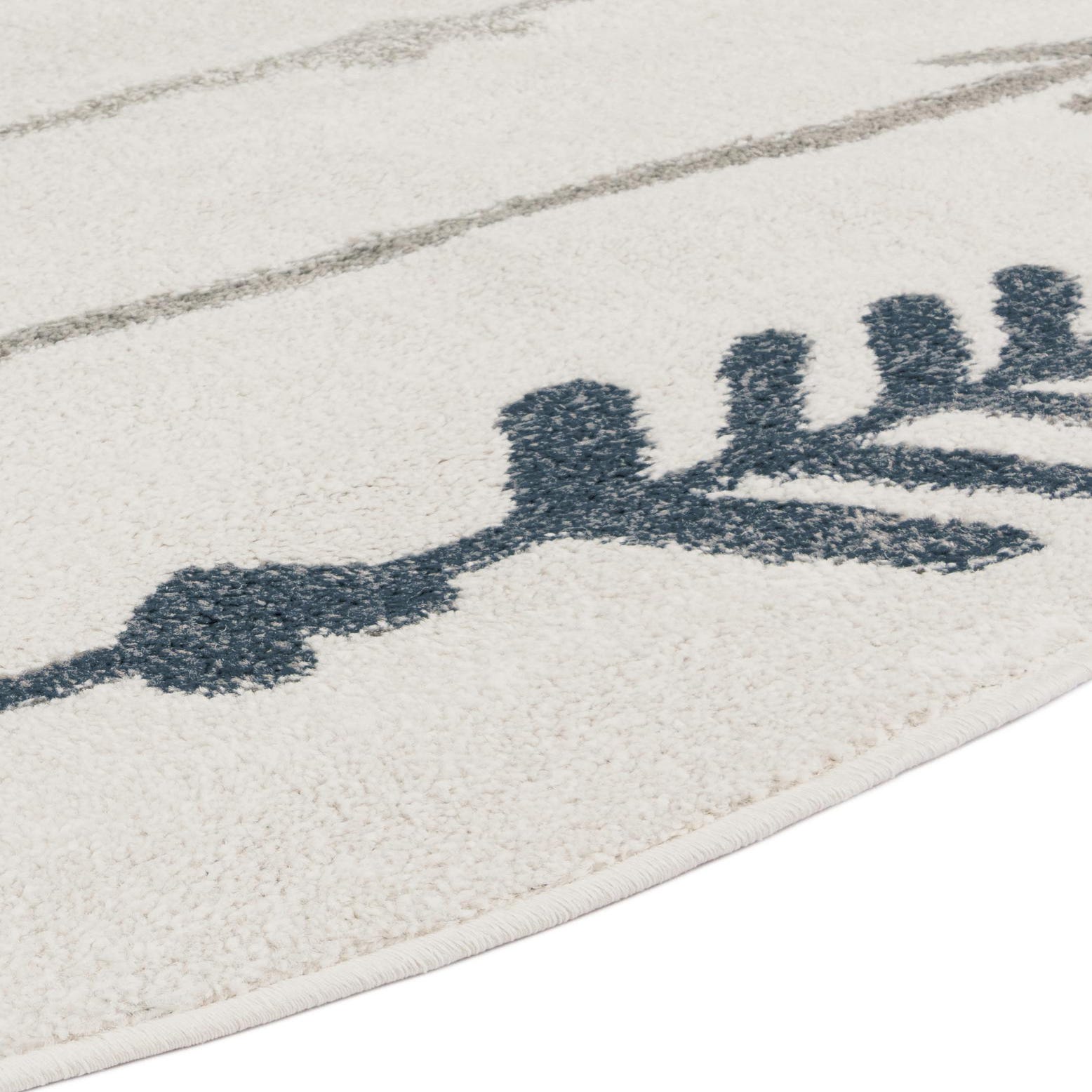 This round rug works well in small, focused spaces — place it under a bistro table, at the foot of a bed, in a nursery or kids’ room, or as a welcoming accent in an entry or reading nook. Its soft neutrals and blue accents pair naturally with light woods, navy upholstery, or coastal and modern farmhouse palettes, and it layers nicely over hardwood or tile to add a touch of pattern and comfort.