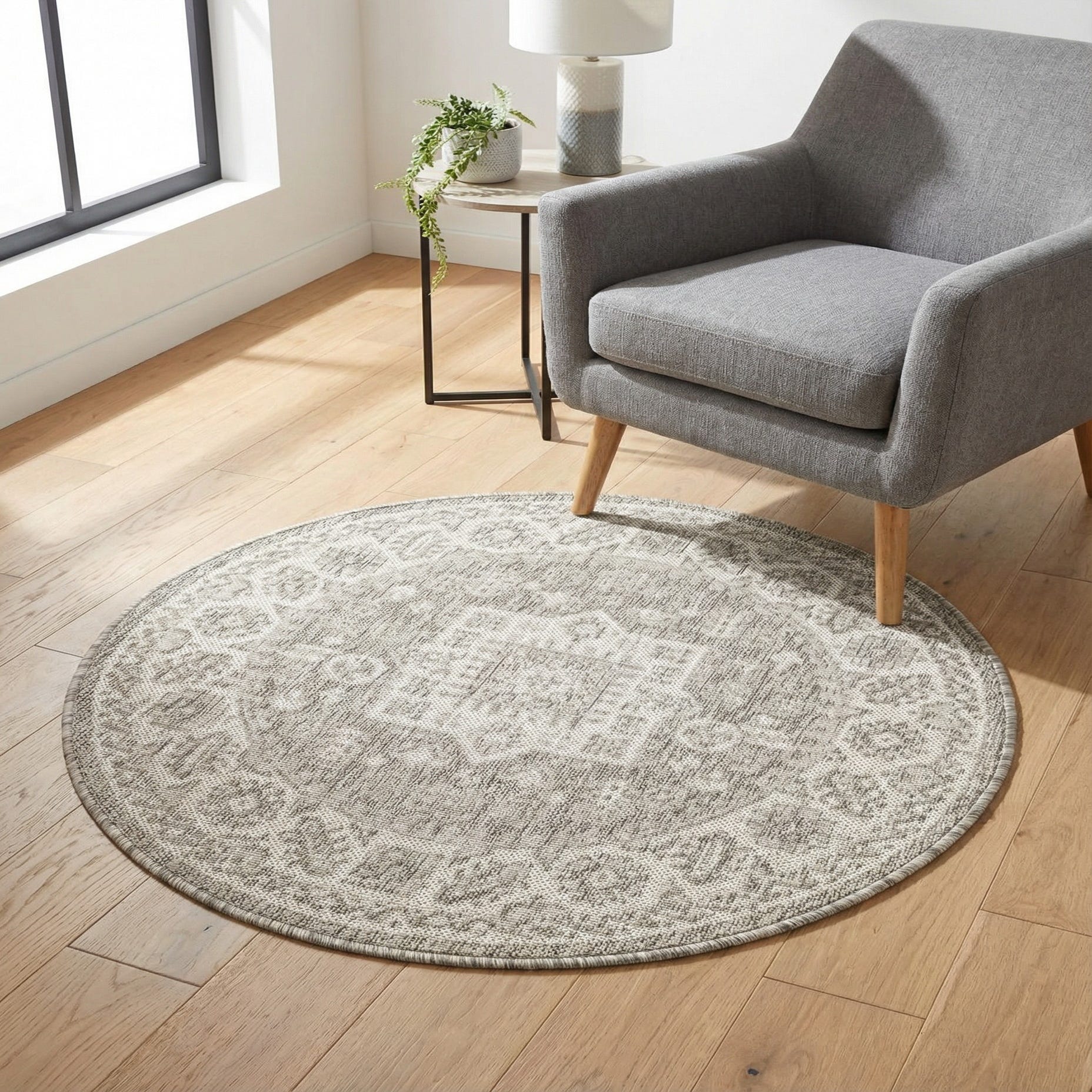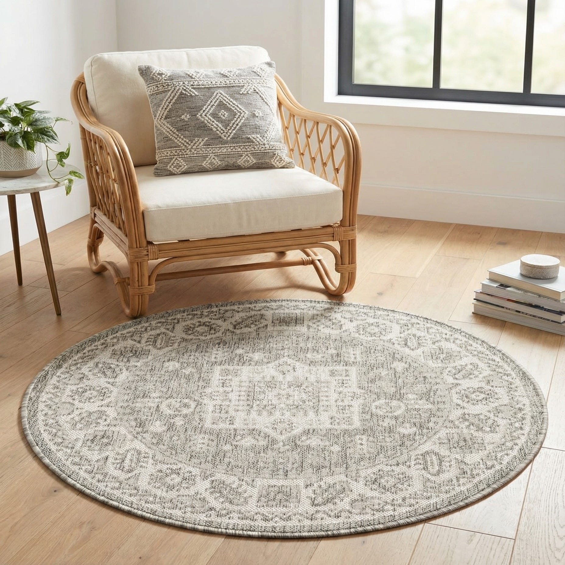 This rug's neutral color palette and timeless pattern allow it to seamlessly blend with a variety of decor styles, including contemporary, bohemian, or minimalistic themes. It can serve as a functional and stylish base for patio furniture, anchor a cozy reading nook, or add a decorative touch to a breezy sunroom. The rug's circular shape also helps to soften angular spaces, providing balance and a harmonious element in your chosen setting.