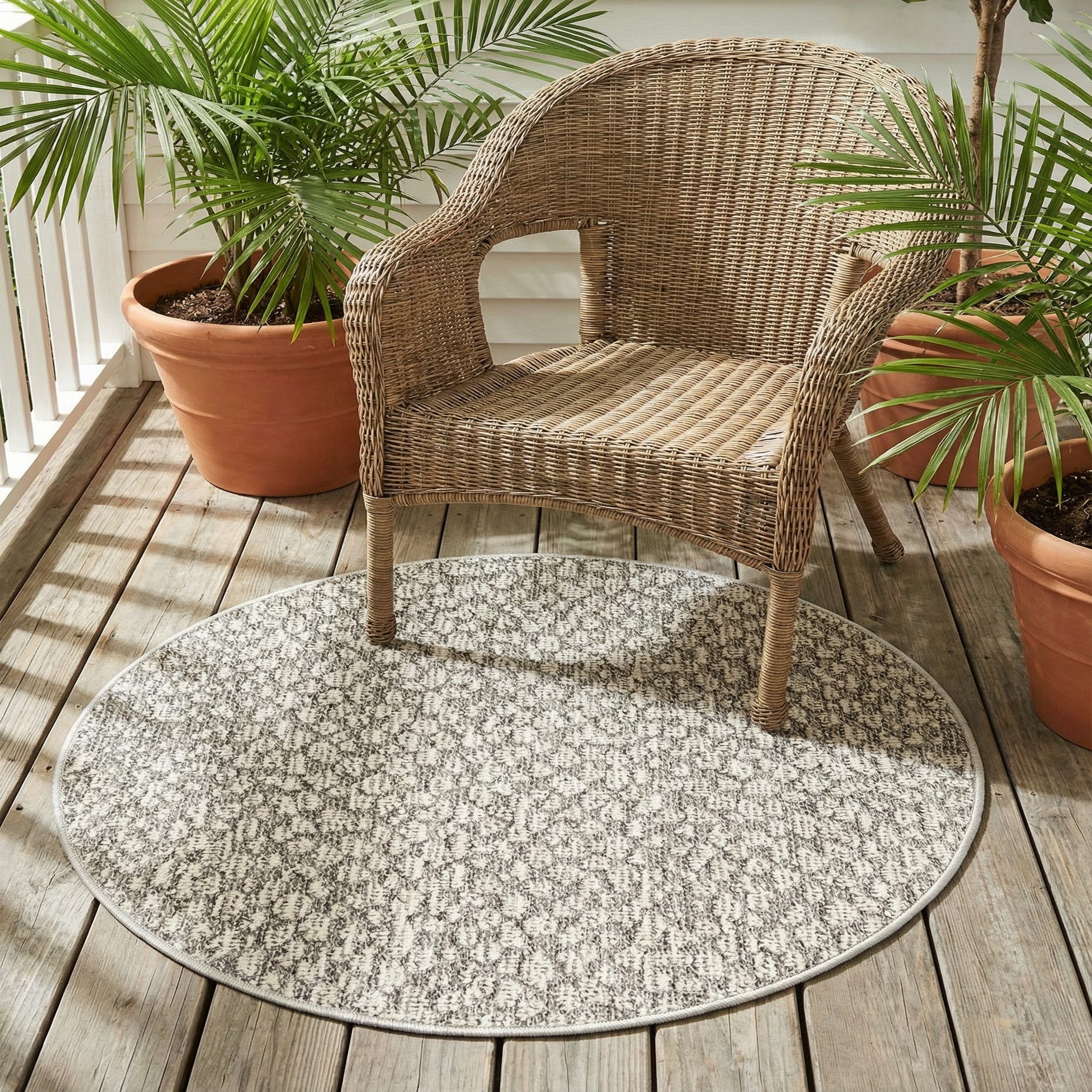 Pair this rug with natural wood or rattan furniture for a relaxed, coastal or modern farmhouse vibe, or let it ground a minimalist patio set for clean, understated contrast. It also works well beneath a bistro table on a balcony, in a sunroom, or layered under a neutral entry bench to add subtle pattern without overpowering a space. The neutral light gray and ivory palette makes it easy to coordinate with warm woods, woven textures, and muted metals.