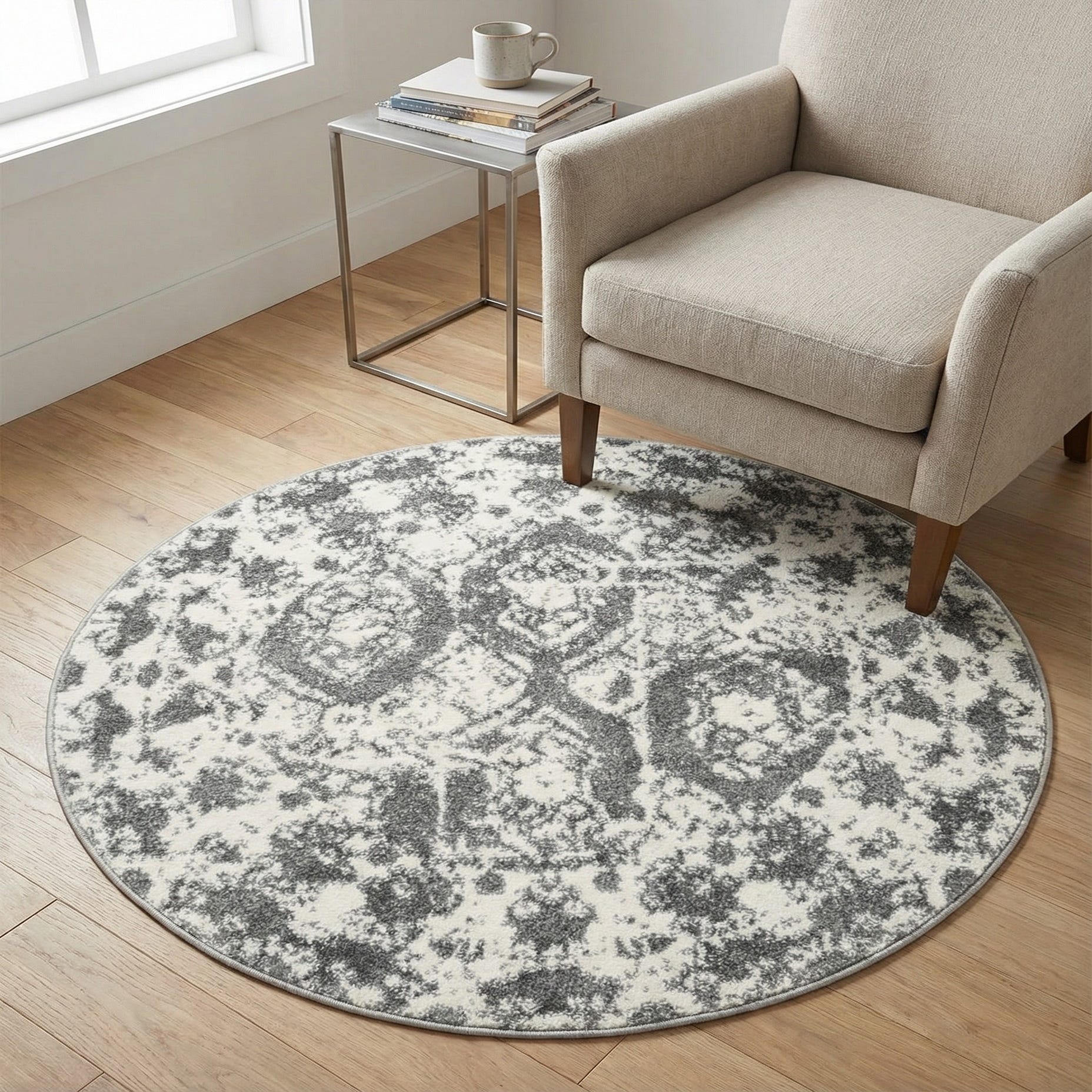 This rug works well in compact or circular layouts where shape matters: place it beneath a small bistro table, in a reading nook, or at the foot of a bed to add subtle pattern without overwhelming the space. It pairs nicely with pale woods and cool metal finishes, and fits transitional, Scandinavian, or modern farmhouse schemes that favor muted tones and layered textures.